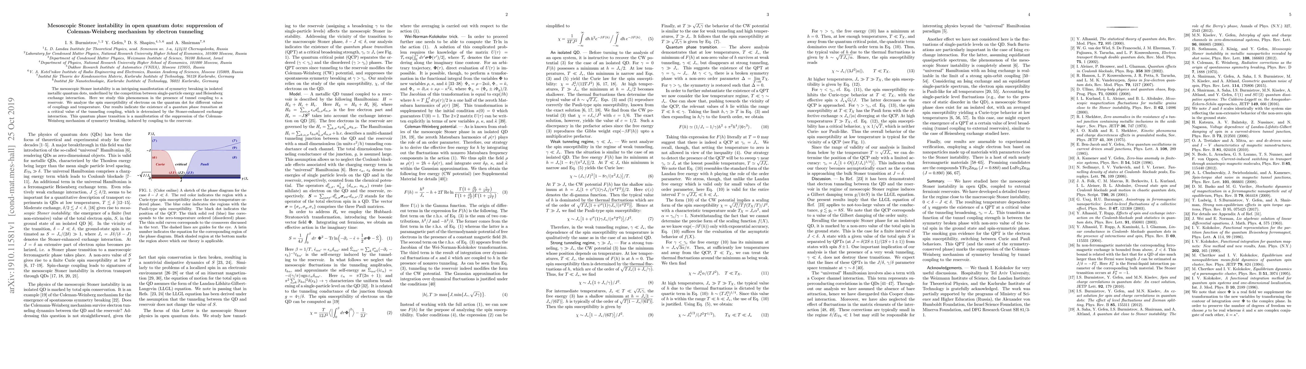 The mesoscopic Stoner instability in open quantum dots is suppressed by electron tunneling, leading to a quantum phase transition driven by the Stoner-enhanced exchange interaction. This transition suppresses the Coleman-Weinberg mechanism of symmetry breaking, highlighting the impact of tunnel coupling on the system's spin susceptibility.