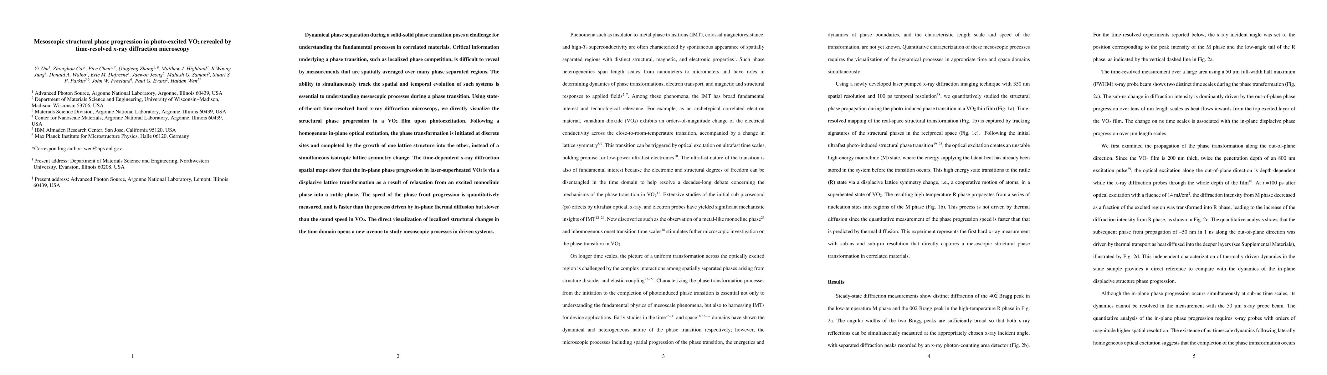 Dynamical phase separation during a solid-solid phase transition poses a challenge for understanding the fundamental processes in correlated materials. Critical information underlying a phase transition, such as localized phase competition, is difficult to reveal by measurements that are spatially averaged over many phase separated regions. The ability to simultaneously track the spatial and temporal evolution of such systems is essential to understanding mesoscopic processes during a phase transition. Using state-of-the-art time-resolved hard x-ray diffraction microscopy, we directly visualize the structural phase progression in a VO2 film upon photoexcitation. Following a homogenous in-plane optical excitation, the phase transformation is initiated at discrete sites and completed by the growth of one lattice structure into the other, instead of a simultaneous isotropic lattice symmetry change. The time-dependent x-ray diffraction spatial maps show that the in-plane phase progression in laser-superheated VO2 is via a displacive lattice transformation as a result of relaxation from an excited monoclinic phase into a rutile phase. The speed of the phase front progression is quantitatively measured, and is faster than the process driven by in-plane thermal diffusion but slower than the sound speed in VO2. The direct visualization of localized structural changes in the time domain opens a new avenue to study mesoscopic processes in driven systems.