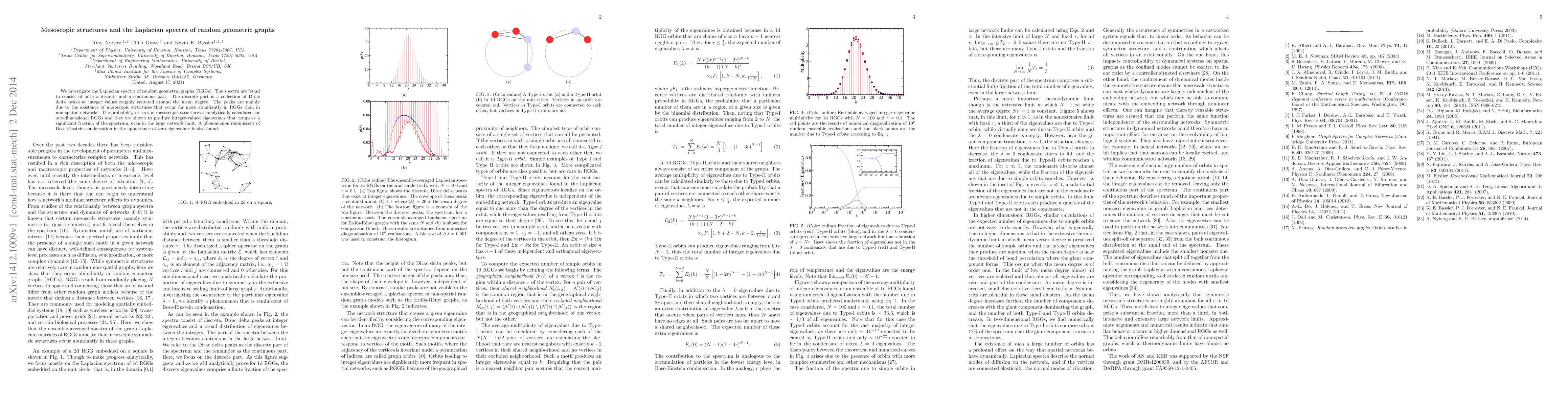 We investigate the Laplacian spectra of random geometric graphs (RGGs). The spectra are found to consist of both a discrete and a continuous part. The discrete part is a collection of Dirac delta peaks at integer values roughly centered around the mean degree. The peaks are mainly due to the existence of mesoscopic structures that occur far more abundantly in RGGs than in non-spatial networks. The probability of certain mesoscopic structures is analytically calculated for one-dimensional RGGs and they are shown to produce integer-valued eigenvalues that comprise a significant fraction of the spectrum, even in the large network limit. A phenomenon reminiscent of Bose-Einstein condensation in the appearance of zero eigenvalues is also found.