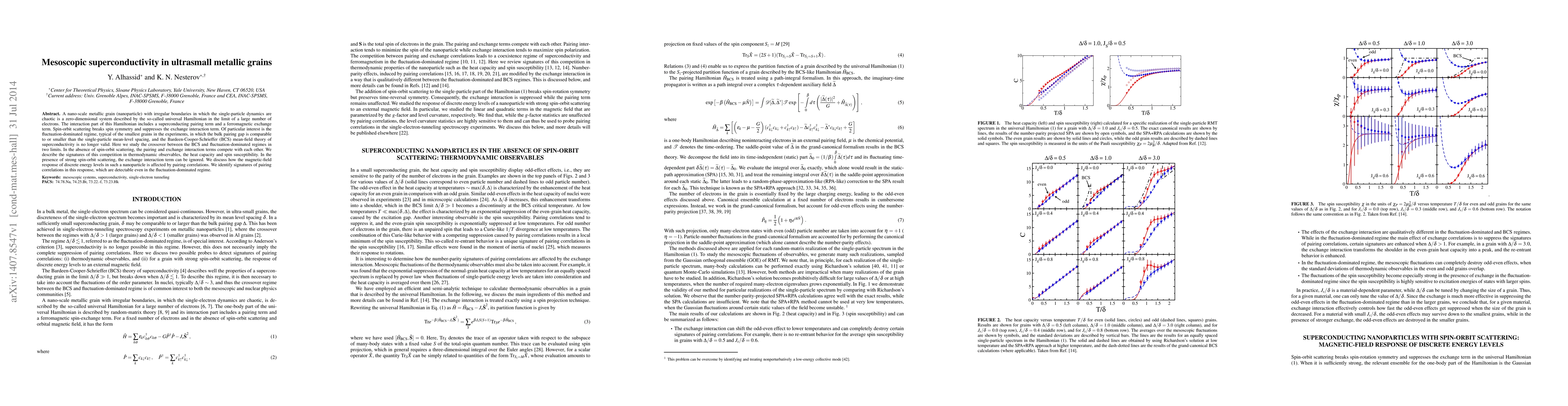 This paper investigates the mesoscopic superconductivity in ultrasmall metallic nanoparticles, focusing on the crossover between BCS and fluctuation-dominated regimes. It examines the competition between superconducting and ferromagnetic interactions and identifies signatures of pairing correlations in thermodynamic observables and magnetic-field response.