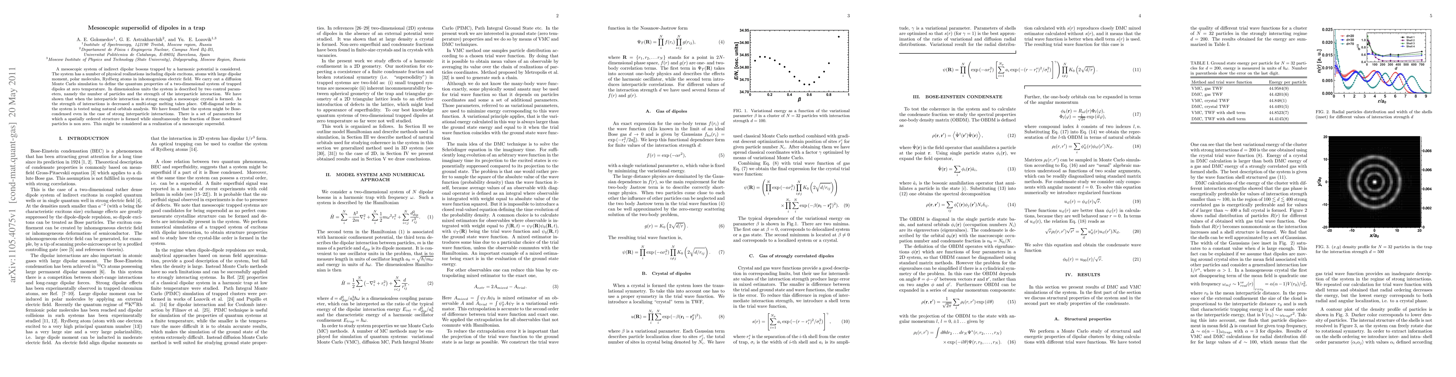This research uses diffusion Monte Carlo simulation to study a 2D system of strongly interacting dipoles in a trap, demonstrating a mesoscopic supersolid phase where a spatially ordered structure coexists with Bose condensation, applicable to systems like dipole excitons, polar molecules, and Rydberg atoms in electric fields.