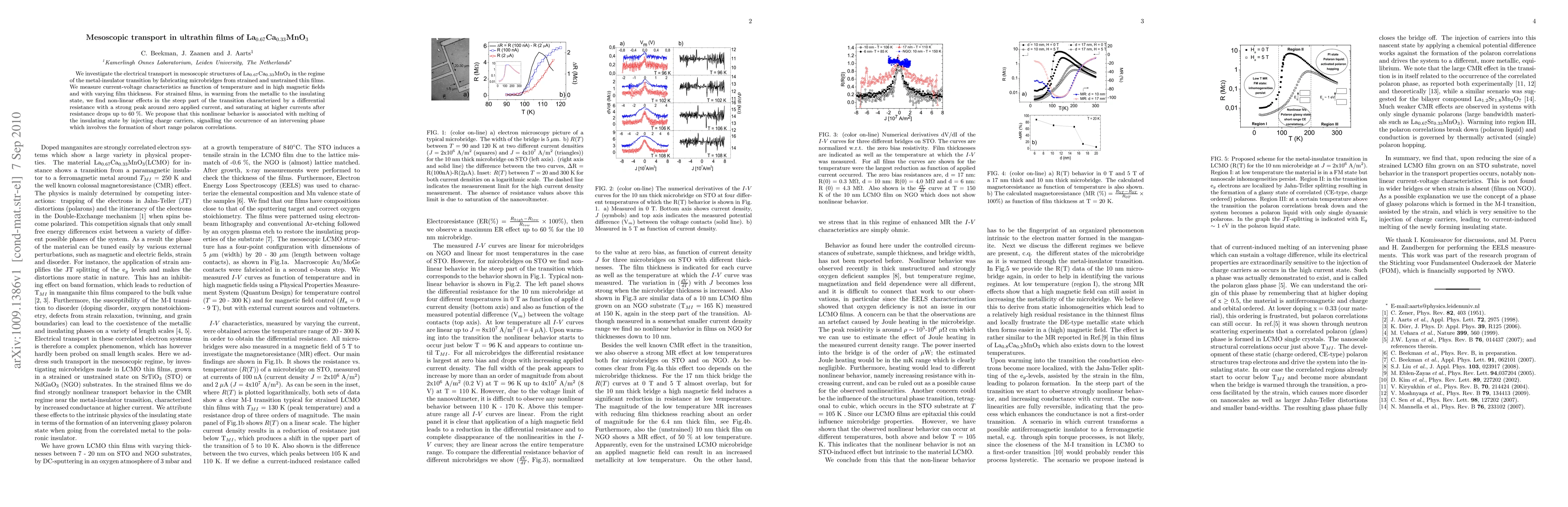 The work distinguishes itself by focusing on mesoscopic transport in strained ultrathin films of La0.67Ca0.33MnO3, revealing novel nonlinear behavior associated with charge carrier injection and an intervening phase characterized by short-range polaron correlations.