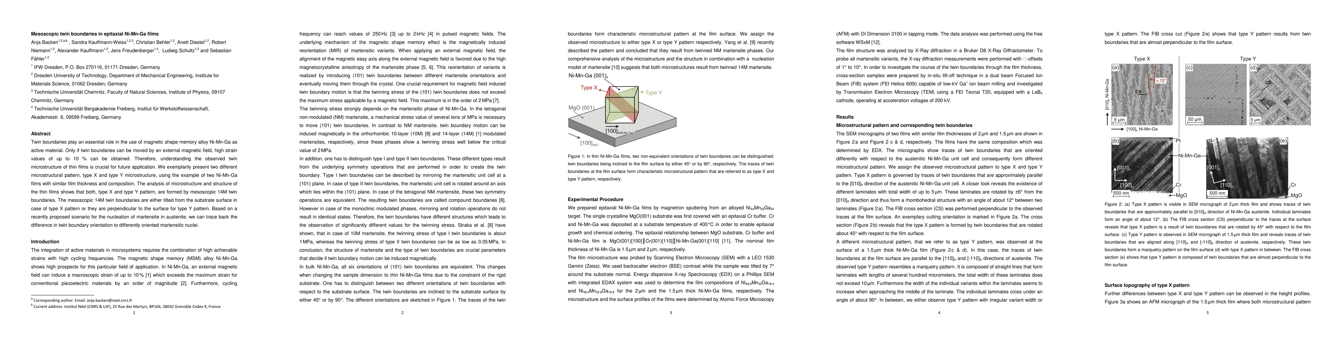 This paper investigates the mesoscopic twin boundaries in epitaxial Ni-Mn-Ga films, crucial for magnetic shape memory applications. It identifies two microstructural patterns, type X and type Y, both formed by 14M twin boundaries, differing in orientation relative to the substrate surface.