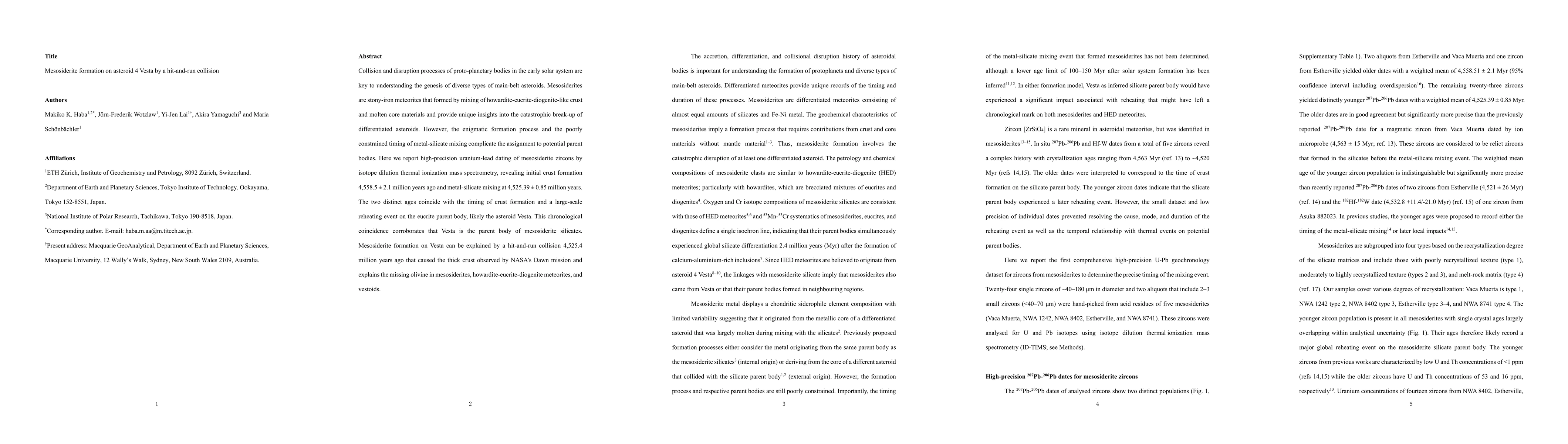This study uses uranium-lead dating to determine that mesosiderites formed from a hit-and-run collision on asteroid Vesta 4,525.4 million years ago, mixing crust and core materials. The findings support Vesta as the parent body of mesosiderites, providing insights into the catastrophic break-up of differentiated asteroids.