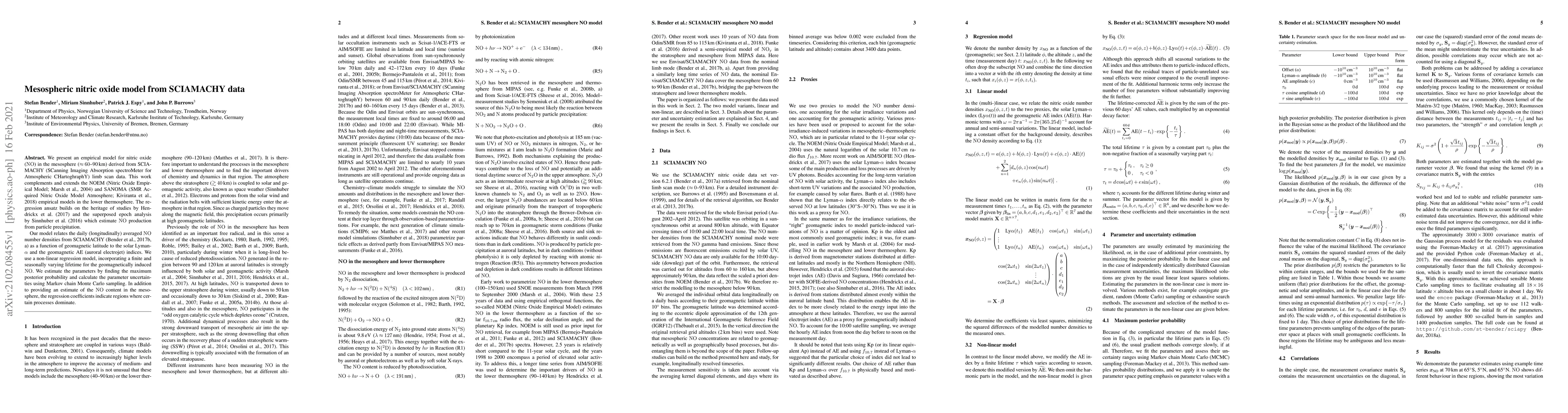 This paper develops an empirical model for mesospheric nitric oxide (NO) using SCIAMACHY data, extending previous models. The model correlates daily NO densities with solar and geomagnetic indices, employing non-linear regression and Monte Carlo sampling to estimate parameters and uncertainties.