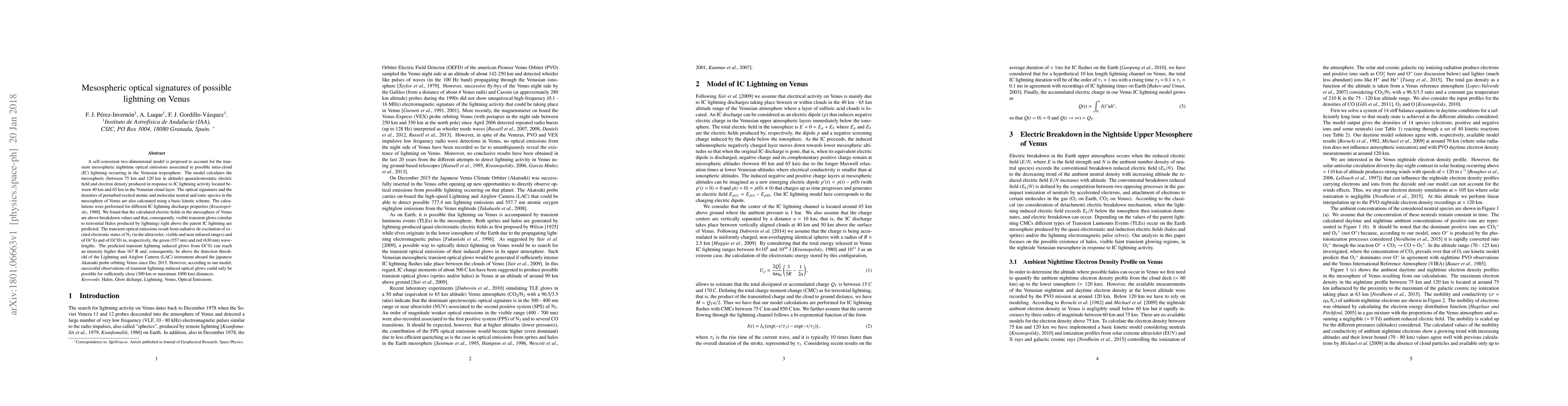 A self-consistent two-dimensional model is proposed to account for the transient mesospheric nighttime optical emissions associated to possible intra-cloud (IC) lightning occurring in the Venusian troposphere. The model calculates the mesospheric (between 75 km and 120 km in altitude) quasielestrostatic electric field and electron density produced in response to IC lightning activity located beween 40 km and 65 km in the Venusian cloud layer. The optical signatures and the densities of perturbed excited atomic and molecular neutral and ionic species in the mesosphere of Venus are also calcutated using a basic kinetic scheme. The calculations were performed for different IC lightning discharge properties [Krasnopolsky (1980), Cosmic. Res.]. We found that the calculated electric fields in the mesosphere of Venus are above breakdown values and that, consequently, visible transient glows (similar to terrestrial Halos produced by lightning) right above the parent IC lightning are predicted. The transient optical emissions result from radiative de-excitation of excited electronic states of N$_2$ (in the ultraviolet, visible and near infrared ranges) and of O($^{1}$S) and of O($^{1}$D) in, respectively, the green (557 nm) and red (630 nm) wavelengths. The predicted transient lightning induced glows from O($^{1}$S) can reach an intensity higher than 167 R and, consequently, be above the detection threshold of the Lightning and Airglow Camera (LAC) instrument aboard the japanese Akatsuki probe orbiting Venus since Dec 2015. However, according to our model, successful observations of transient lightning-induced optical glows could only be possible for sufficiently close (300 km or maximum 1000 km) distances.