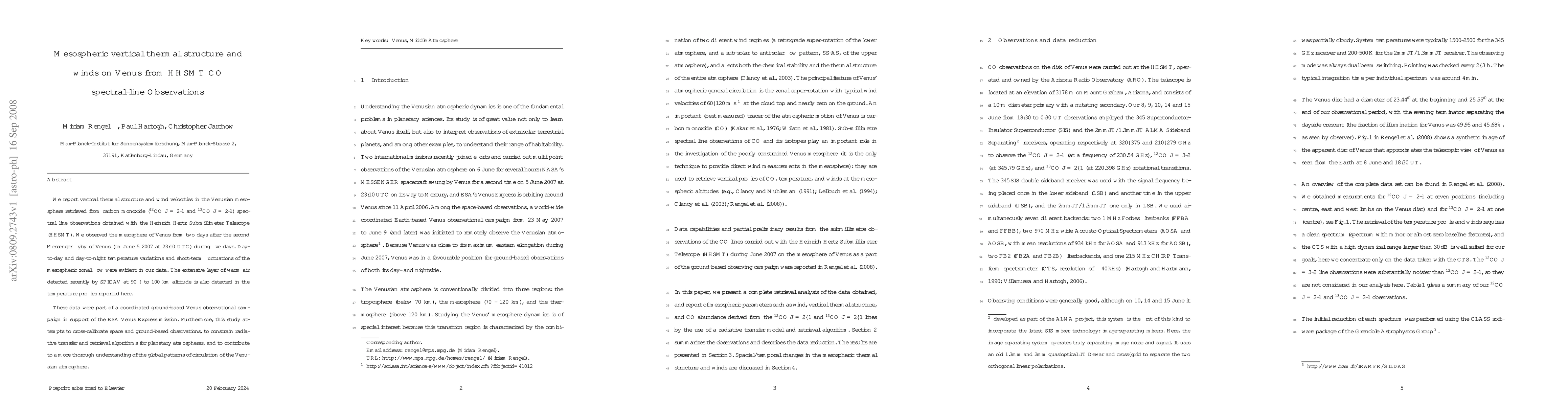 This study retrieves vertical thermal structure and wind velocities in Venus' mesosphere using spectral-line observations from the Heinrich Hertz Submillimeter Telescope. The data reveal day-to-day and day-to-night temperature variations and mesospheric zonal flow fluctuations, supporting the ESA Venus Express mission and aiming to improve understanding of Venus' atmospheric circulation.