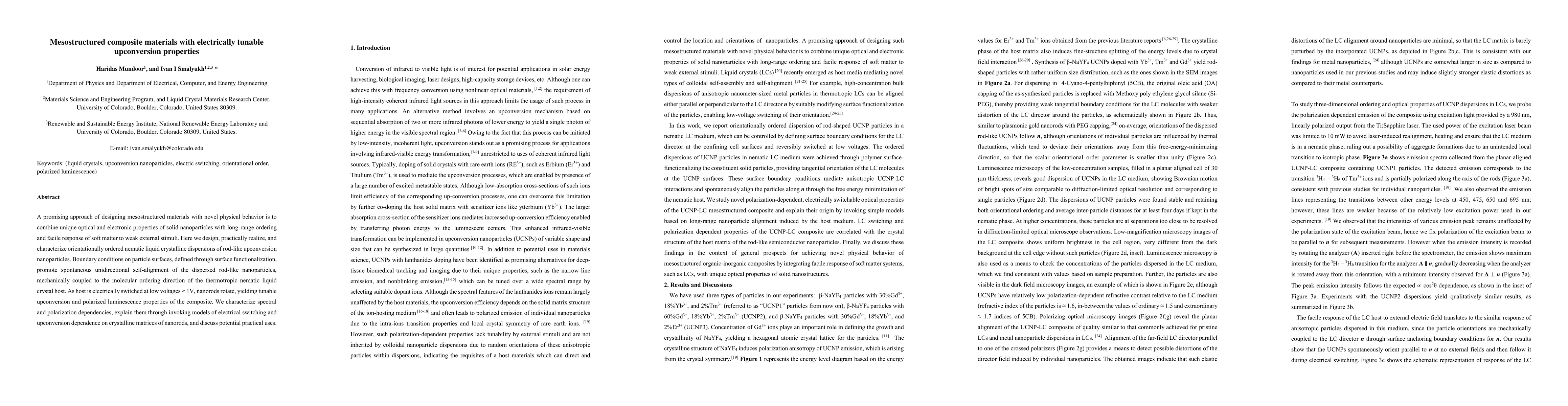 This paper details the design and realization of mesostructured composite materials comprising nematic liquid crystalline dispersions of rod-like upconversion nanoparticles, which exhibit electrically tunable upconversion and polarized luminescence properties. The study explores the influence of surface functionalization and electrical switching on the material's optical behavior and potential applications.