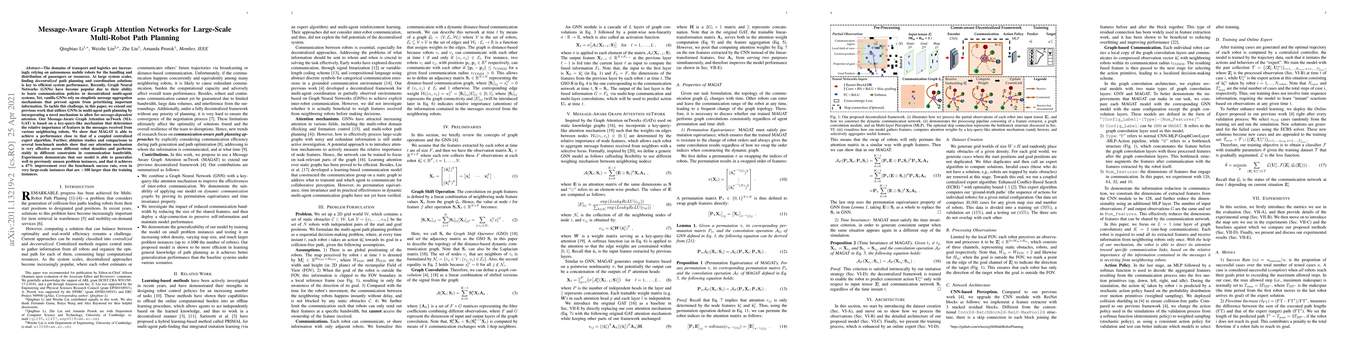 The domains of transport and logistics are increasingly relying on autonomous mobile robots for the handling and distribution of passengers or resources. At large system scales, finding decentralized path planning and coordination solutions is key to efficient system performance. Recently, Graph Neural Networks (GNNs) have become popular due to their ability to learn communication policies in decentralized multi-agent systems. Yet, vanilla GNNs rely on simplistic message aggregation mechanisms that prevent agents from prioritizing important information. To tackle this challenge, in this paper, we extend our previous work that utilizes GNNs in multi-agent path planning by incorporating a novel mechanism to allow for message-dependent attention. Our Message-Aware Graph Attention neTwork (MAGAT) is based on a key-query-like mechanism that determines the relative importance of features in the messages received from various neighboring robots. We show that MAGAT is able to achieve a performance close to that of a coupled centralized expert algorithm. Further, ablation studies and comparisons to several benchmark models show that our attention mechanism is very effective across different robot densities and performs stably in different constraints in communication bandwidth. Experiments demonstrate that our model is able to generalize well in previously unseen problem instances, and that it achieves a 47\% improvement over the benchmark success rate, even in very large-scale instances that are $\times$100 larger than the training instances.
