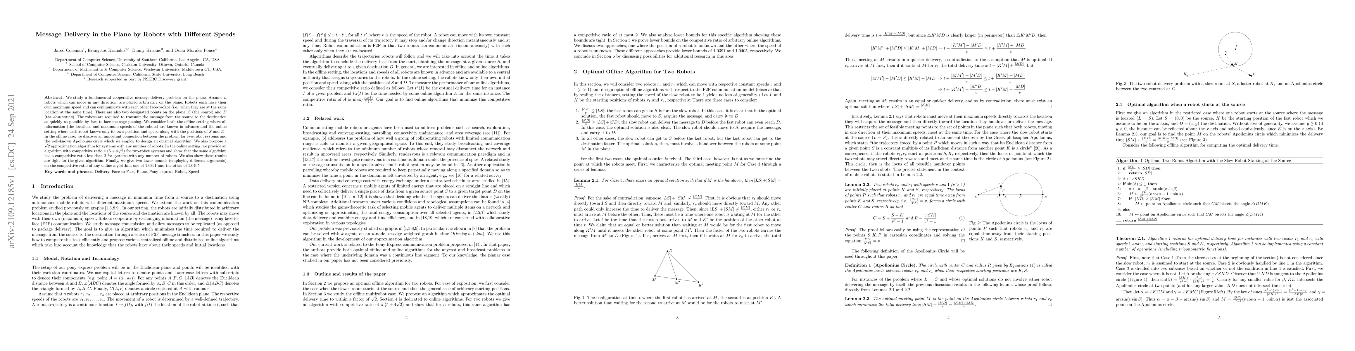 Researchers developed algorithms to optimize message delivery by robots with different speeds on a plane, achieving approximations of 1.0391 and 2 for offline and online settings, respectively.