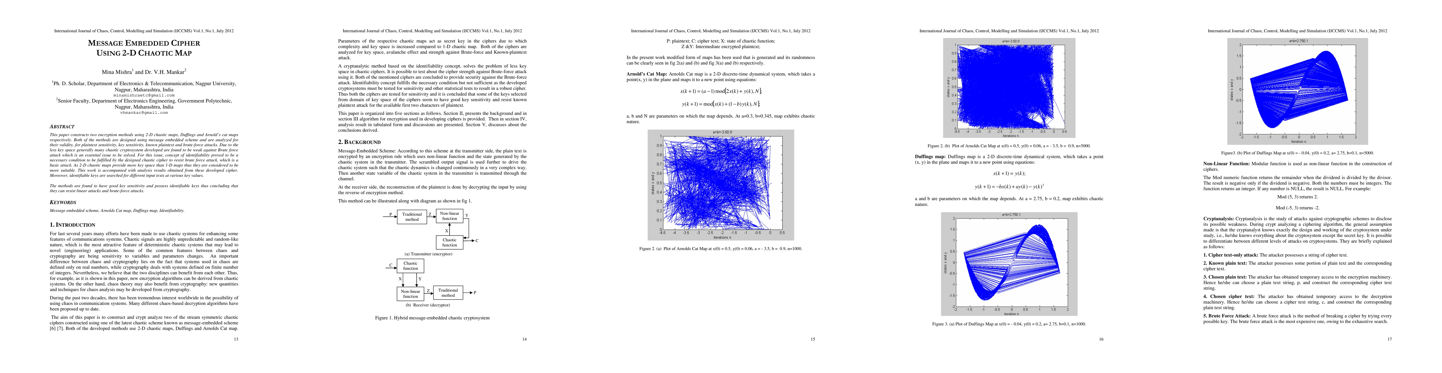 This paper constructs two encryption methods using 2-D chaotic maps, Duffings and Arnold's cat maps respectively. Both of the methods are designed using message embedded scheme and are analyzed for their validity, for plaintext sensitivity, key sensitivity, known plaintext and brute-force attacks. Due to the less key space generally many chaotic cryptosystem developed are found to be weak against Brute force attack which is an essential issue to be solved. For this issue, concept of identifiability proved to be a necessary condition to be fulfilled by the designed chaotic cipher to resist brute force attack, which is a basic attack. As 2-D chaotic maps provide more key space than 1-D maps thus they are considered to be more suitable. This work is accompanied with analysis results obtained from these developed cipher. Moreover, identifiable keys are searched for different input texts at various key values. The methods are found to have good key sensitivity and possess identifiable keys thus concluding that they can resist linear attacks and brute-force attacks.