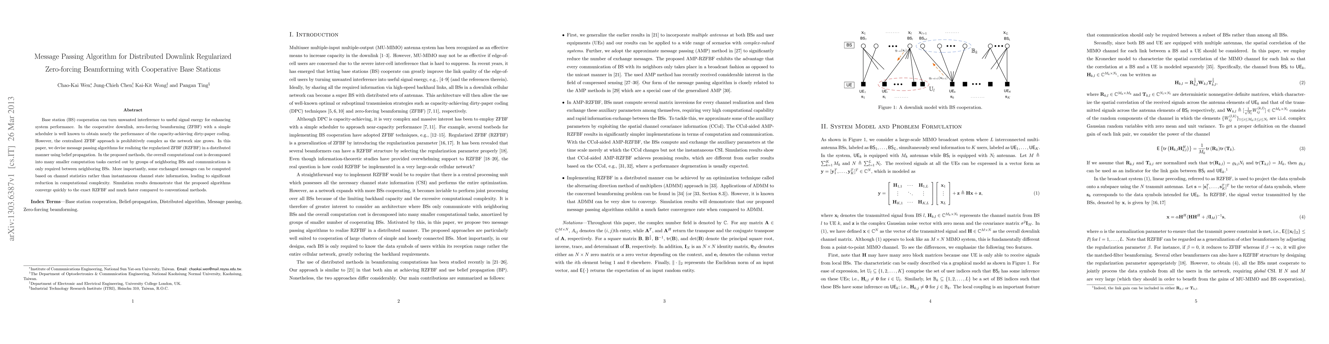 This paper proposes a message passing algorithm for distributed downlink regularized zero-forcing beamforming (RZFBF) using cooperative base stations, significantly reducing computational complexity by distributing tasks among neighboring BSs and leveraging channel statistics. Simulation results show fast convergence and improved performance compared to conventional centralized methods.