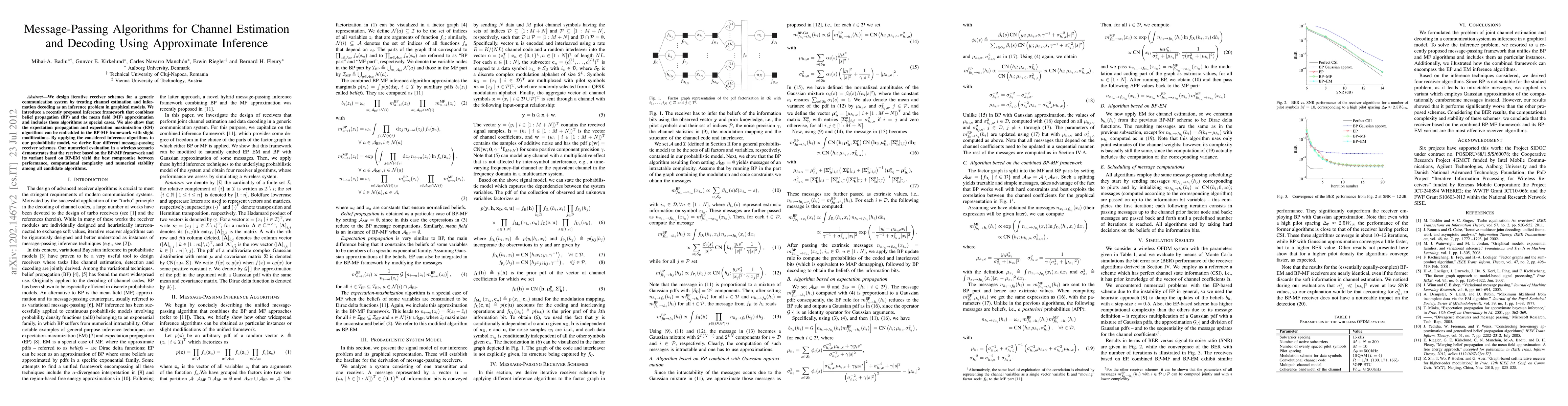 Researchers developed iterative receiver schemes for wireless communication systems using graphical models and message-passing algorithms, finding that a specific framework combining belief propagation and mean field approximation yields the best performance balance.