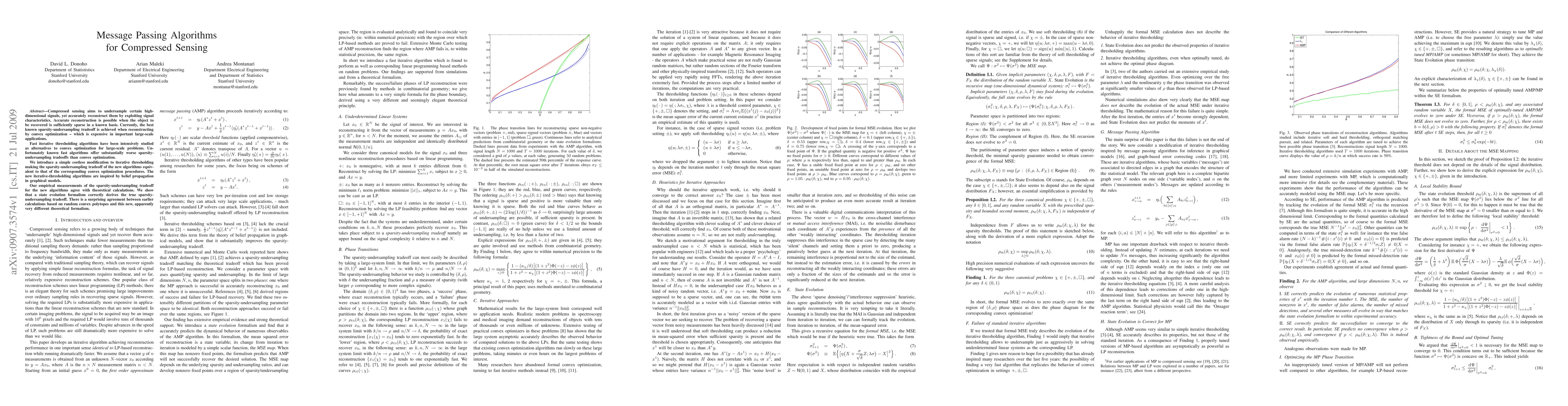 Compressed sensing aims to undersample certain high-dimensional signals, yet accurately reconstruct them by exploiting signal characteristics. Accurate reconstruction is possible when the object to be recovered is sufficiently sparse in a known basis. Currently, the best known sparsity-undersampling tradeoff is achieved when reconstructing by convex optimization -- which is expensive in important large-scale applications. Fast iterative thresholding algorithms have been intensively studied as alternatives to convex optimization for large-scale problems. Unfortunately known fast algorithms offer substantially worse sparsity-undersampling tradeoffs than convex optimization. We introduce a simple costless modification to iterative thresholding making the sparsity-undersampling tradeoff of the new algorithms equivalent to that of the corresponding convex optimization procedures. The new iterative-thresholding algorithms are inspired by belief propagation in graphical models. Our empirical measurements of the sparsity-undersampling tradeoff for the new algorithms agree with theoretical calculations. We show that a state evolution formalism correctly derives the true sparsity-undersampling tradeoff. There is a surprising agreement between earlier calculations based on random convex polytopes and this new, apparently very different theoretical formalism.