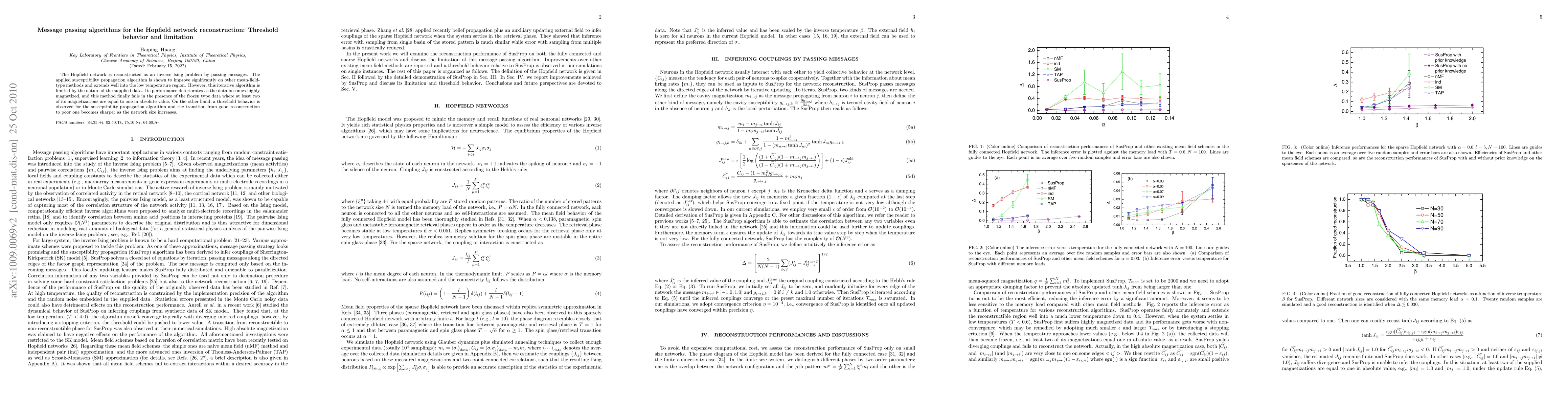 The Hopfield network is reconstructed as an inverse Ising problem by passing messages. The applied susceptibility propagation algorithm is shown to improve significantly on other mean-field-type methods and extends well into the low temperature region. However, this iterative algorithm is limited by the nature of the supplied data. Its performance deteriorates as the data becomes highly magnetized, and this method finally fails in the presence of the frozen type data where at least two of its magnetizations are equal to one in absolute value. On the other hand, a threshold behavior is observed for the susceptibility propagation algorithm and the transition from good reconstruction to poor one becomes sharper as the network size increases.