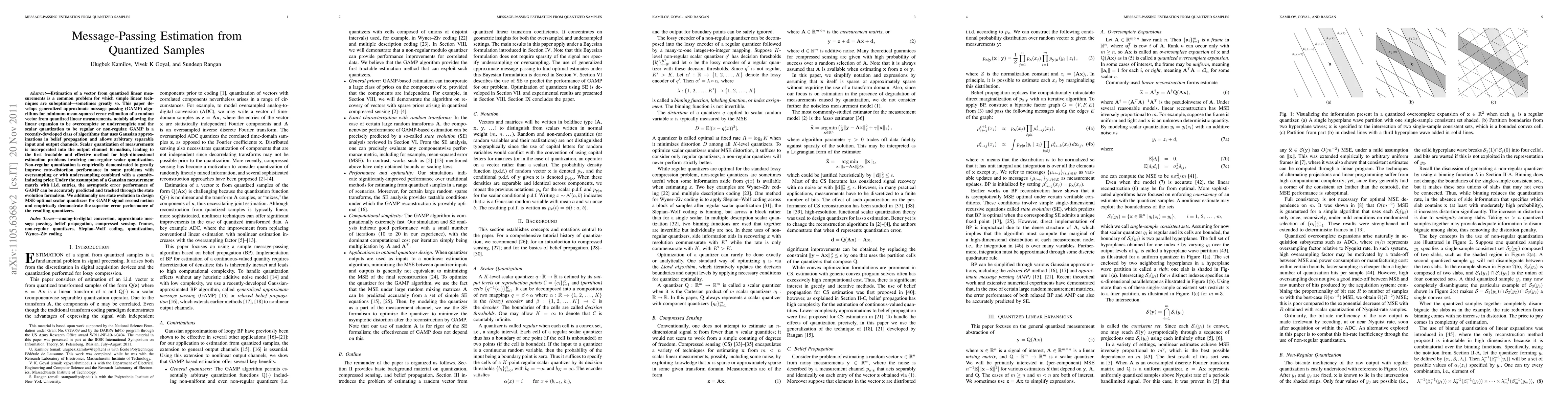 This paper develops generalized approximate message passing (GAMP) algorithms for minimum mean-squared error estimation from quantized linear measurements, allowing for overcomplete or undercomplete linear expansions and regular or non-regular scalar quantization. The proposed method significantly improves rate-distortion performance and achieves superior error performance through state evolution-designed MSE-optimal quantizers.
