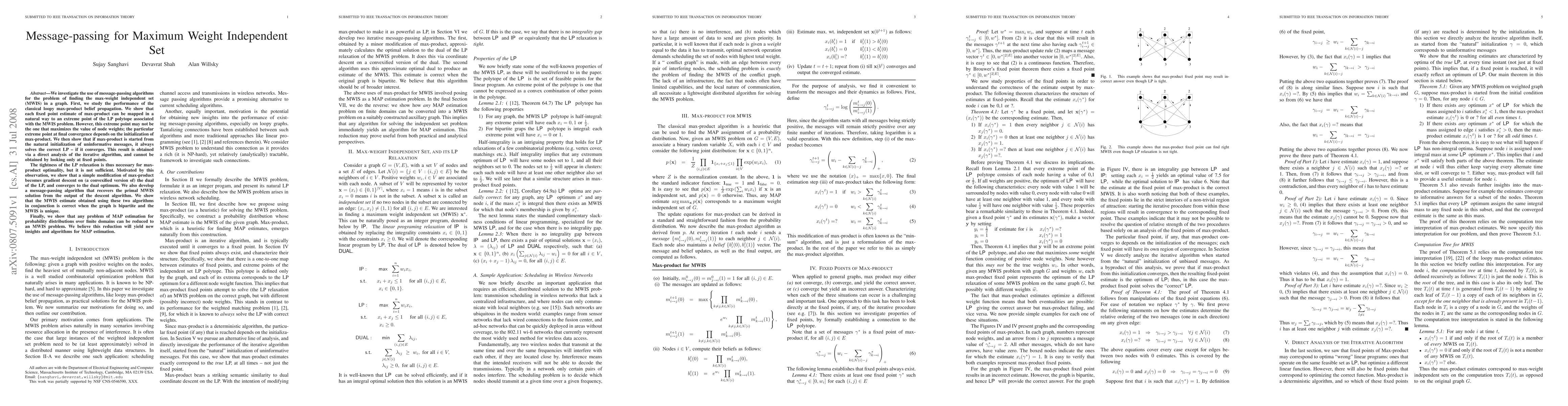 We investigate the use of message-passing algorithms for the problem of finding the max-weight independent set (MWIS) in a graph. First, we study the performance of the classical loopy max-product belief propagation. We show that each fixed point estimate of max-product can be mapped in a natural way to an extreme point of the LP polytope associated with the MWIS problem. However, this extreme point may not be the one that maximizes the value of node weights; the particular extreme point at final convergence depends on the initialization of max-product. We then show that if max-product is started from the natural initialization of uninformative messages, it always solves the correct LP -- if it converges. This result is obtained via a direct analysis of the iterative algorithm, and cannot be obtained by looking only at fixed points. The tightness of the LP relaxation is thus necessary for max-product optimality, but it is not sufficient. Motivated by this observation, we show that a simple modification of max-product becomes gradient descent on (a convexified version of) the dual of the LP, and converges to the dual optimum. We also develop a message-passing algorithm that recovers the primal MWIS solution from the output of the descent algorithm. We show that the MWIS estimate obtained using these two algorithms in conjunction is correct when the graph is bipartite and the MWIS is unique. Finally, we show that any problem of MAP estimation for probability distributions over finite domains can be reduced to an MWIS problem. We believe this reduction will yield new insights and algorithms for MAP estimation.