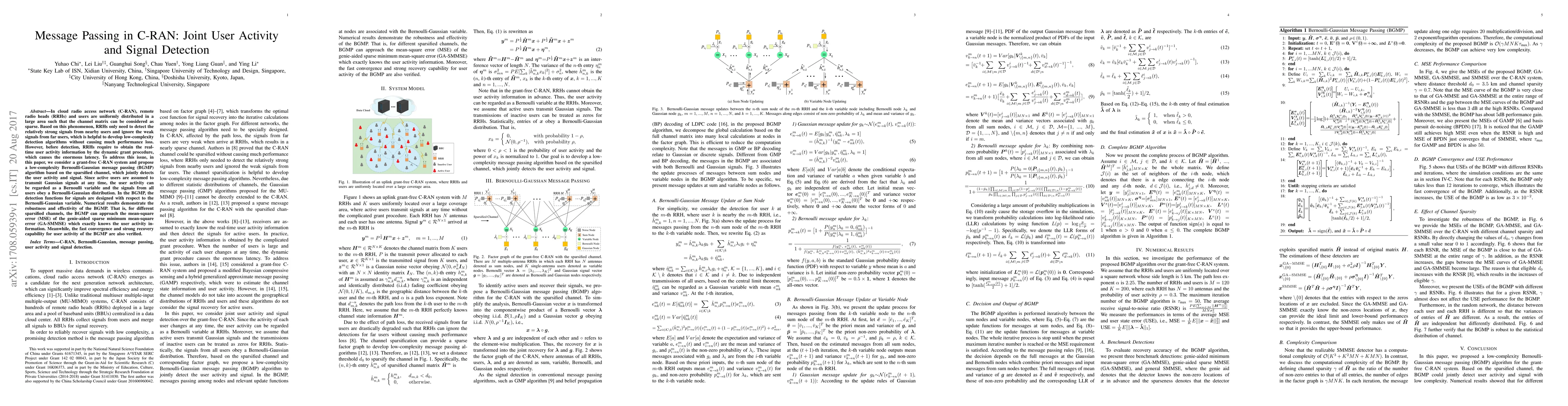 This paper proposes a low-complexity Bernoulli-Gaussian message passing (BGMP) algorithm for grant-free C-RAN systems to jointly detect user activity and signals, effectively addressing latency issues by exploiting the sparsity of the channel matrix. The BGMP algorithm demonstrates robustness, fast convergence, and strong recovery capability for user activity detection, approaching the performance of the optimal GA-SMMSE algorithm.