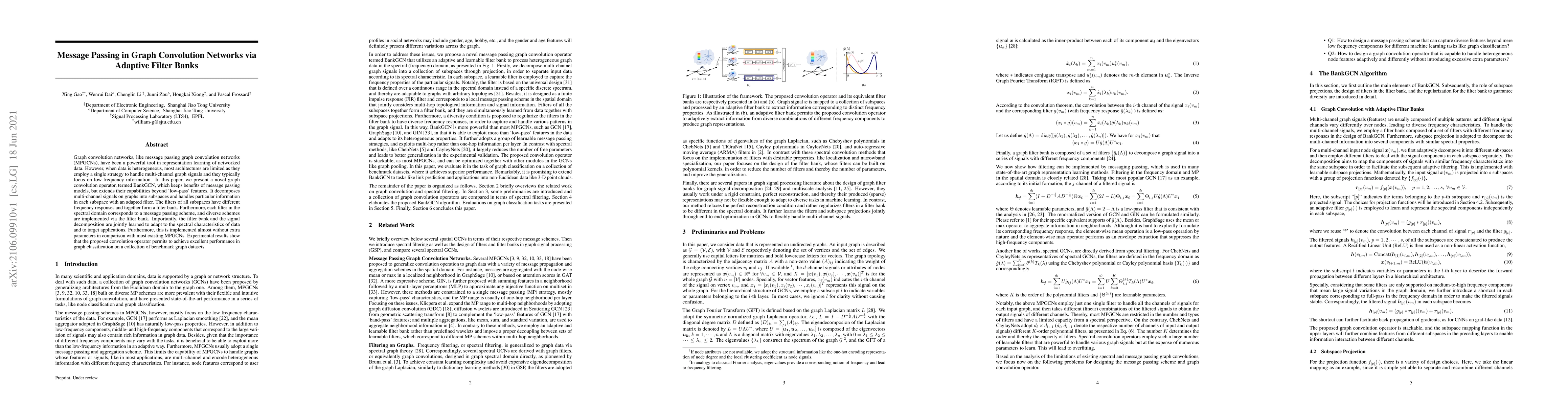 Graph convolution networks, like message passing graph convolution networks (MPGCNs), have been a powerful tool in representation learning of networked data. However, when data is heterogeneous, most architectures are limited as they employ a single strategy to handle multi-channel graph signals and they typically focus on low-frequency information. In this paper, we present a novel graph convolution operator, termed BankGCN, which keeps benefits of message passing models, but extends their capabilities beyond `low-pass' features. It decomposes multi-channel signals on graphs into subspaces and handles particular information in each subspace with an adapted filter. The filters of all subspaces have different frequency responses and together form a filter bank. Furthermore, each filter in the spectral domain corresponds to a message passing scheme, and diverse schemes are implemented via the filter bank. Importantly, the filter bank and the signal decomposition are jointly learned to adapt to the spectral characteristics of data and to target applications. Furthermore, this is implemented almost without extra parameters in comparison with most existing MPGCNs. Experimental results show that the proposed convolution operator permits to achieve excellent performance in graph classification on a collection of benchmark graph datasets.