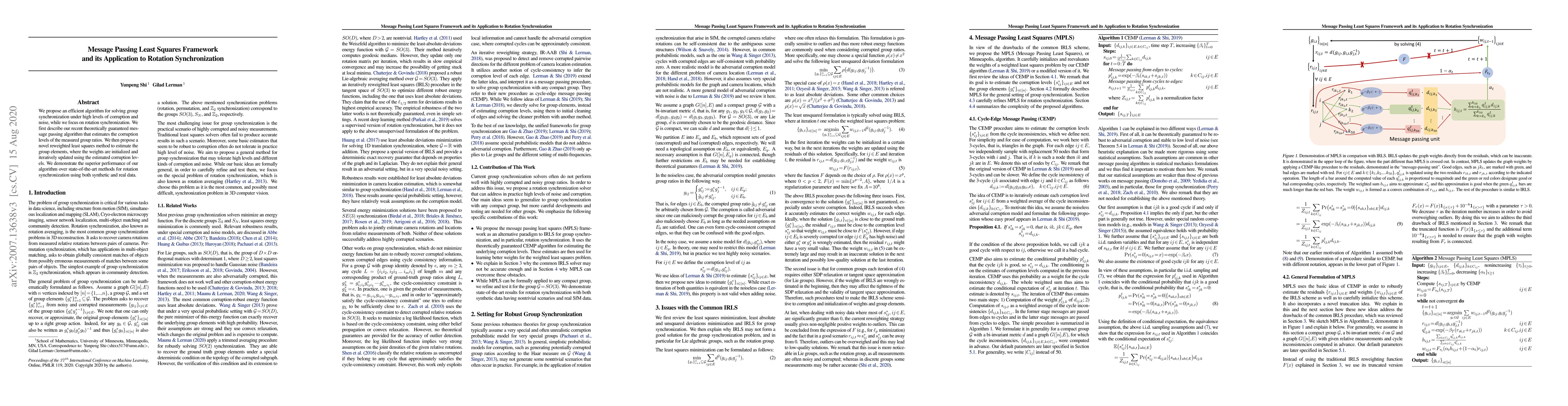 This paper proposes an efficient message passing least squares framework for rotation synchronization under high noise and corruption. It introduces a theoretically guaranteed algorithm to estimate corruption levels and a reweighted least squares method for group element estimation, demonstrating superior performance over existing methods.