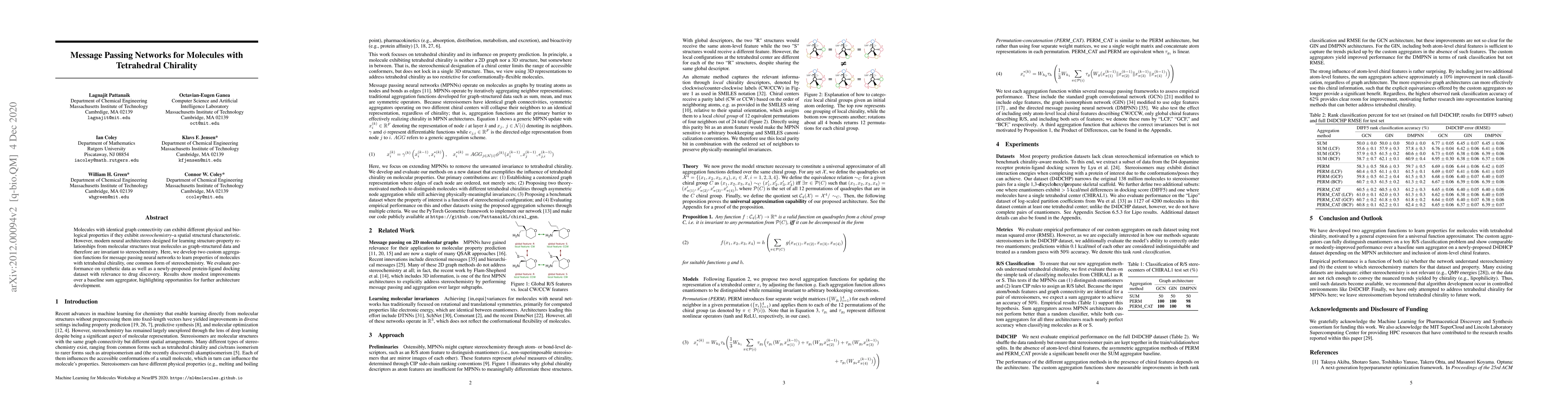 Researchers developed custom aggregation functions for message passing neural networks to learn properties of molecules with tetrahedral chirality, showing modest improvements over a baseline sum aggregator in synthetic data and protein-ligand docking datasets.