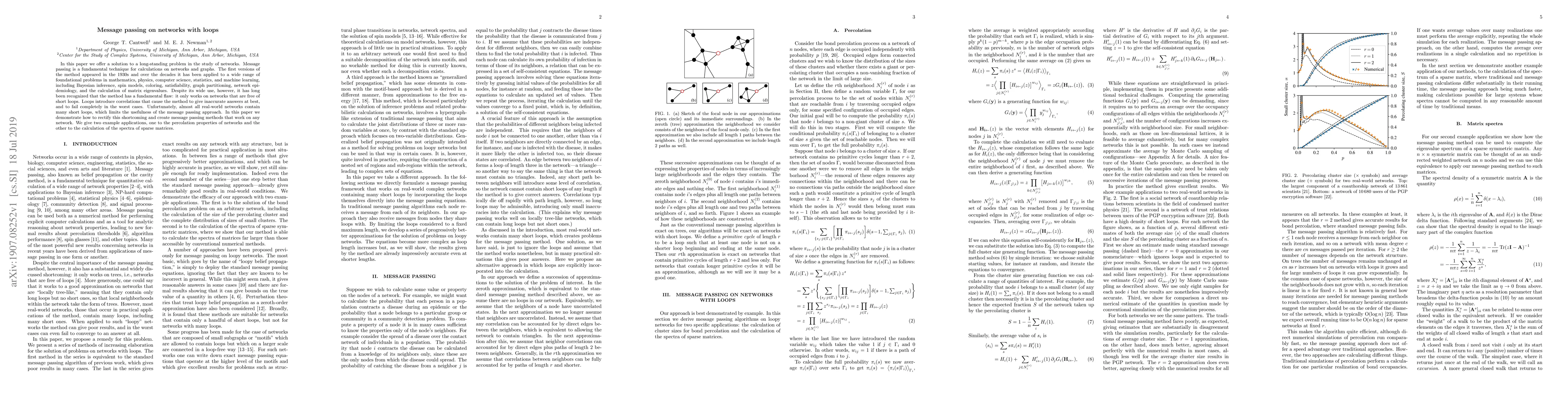 This paper proposes a novel solution to enable accurate message passing on networks with loops, addressing a long-standing limitation that prevents the method from working on real-world networks. The authors demonstrate the effectiveness of their approach through applications in percolation properties and sparse matrix spectra calculations.