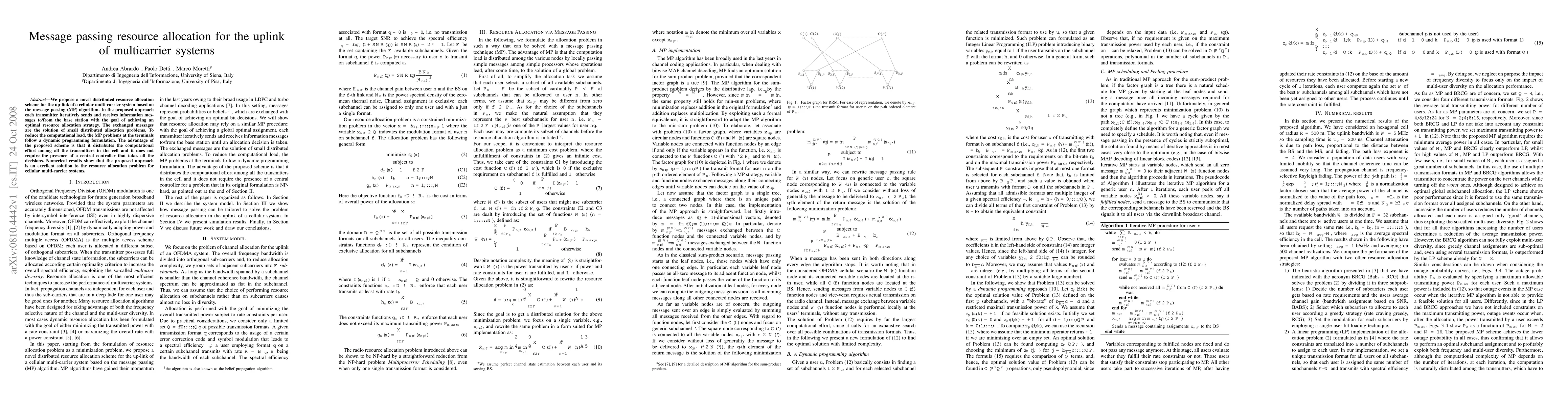 A novel distributed resource allocation scheme using message passing algorithm is proposed for uplink multicarrier systems, distributing computational effort among transmitters without a central controller.