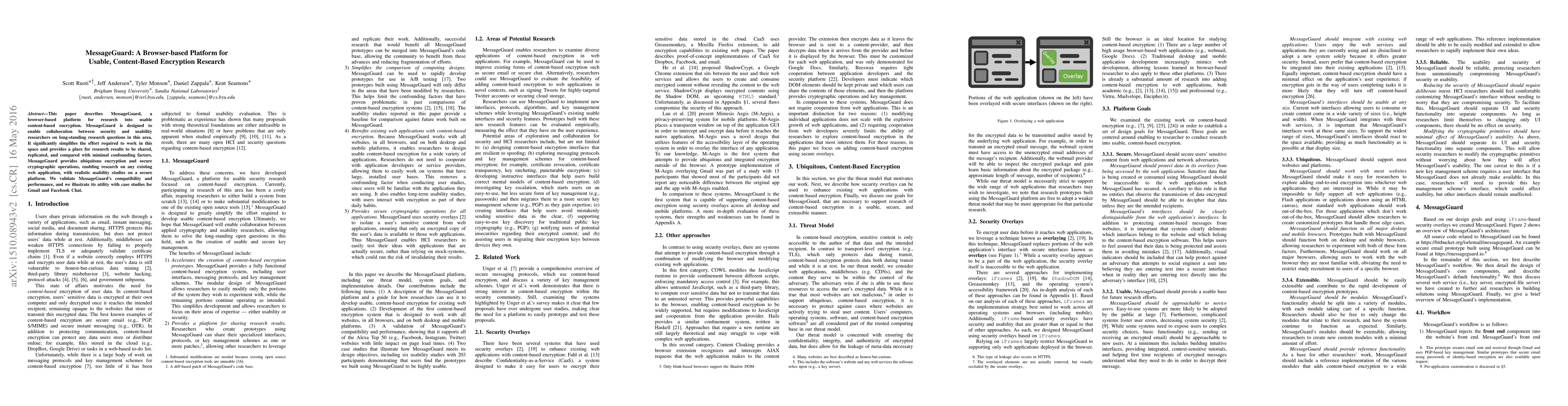 MessageGuard is a browser-based platform designed to facilitate research in usable content-based encryption, enabling collaboration between security and usability researchers. It simplifies the research process and supports realistic usability studies on secure web applications, validated through case studies on Gmail and Facebook Chat.