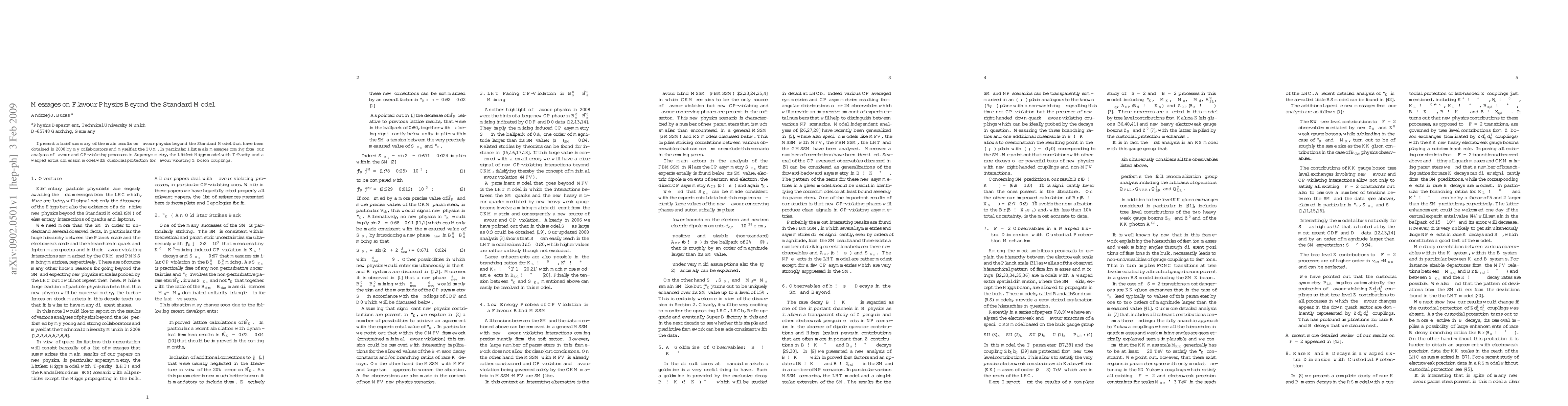I present a brief summary of the main results on flavour physics beyond the Standard Model that have been obtained in 2008 by my collaborators and myself at the TUM. In particular I list main messages coming from our analyses of flavour and CP-violating processes in Supersymmetry, the Littlest Higgs model with T-Parity and a warped extra dimension model with custodial protection for flavour violating $Z$ boson couplings.