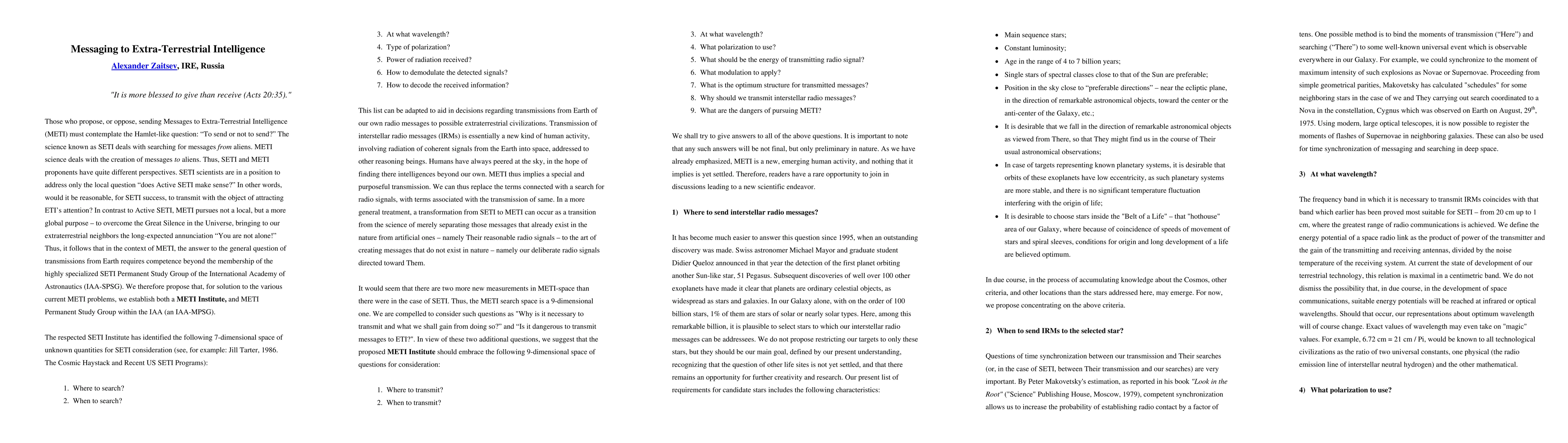 Throughout the entire history of terrestrial civilization, only four projects involving transmitting of interstellar radio messages (IRMs) have yet been fully developed and realized. Nevertheless, we should understand a simple thing -- if all civilizations in the Universe are only recipients, and not message-sending civilizations, than no SETI searches make any sense. We present the theory and methodology of composing and transmitting of future IRMs.