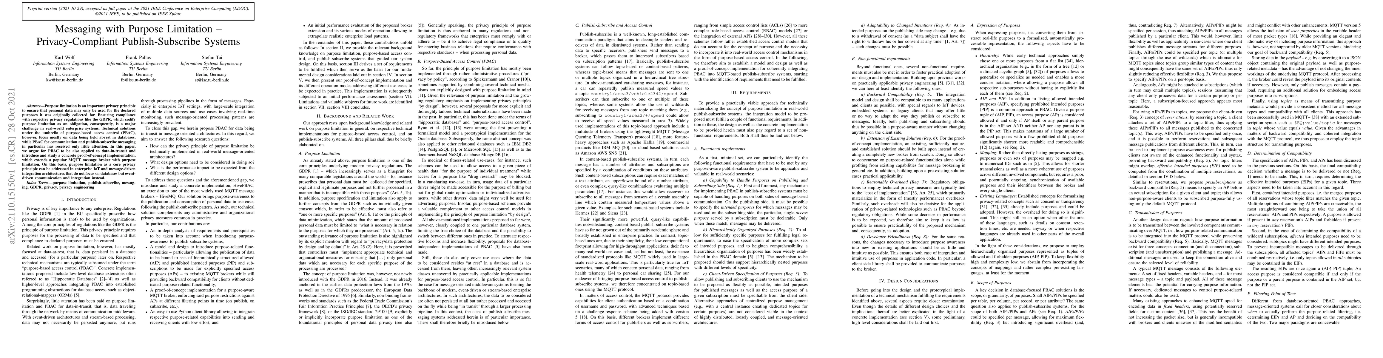 Purpose limitation is an important privacy principle to ensure that personal data may only be used for the declared purposes it was originally collected for. Ensuring compliance with respective privacy regulations like the GDPR, which codify purpose limitation as an obligation, consequently, is a major challenge in real-world enterprise systems. Technical solutions under the umbrella of purpose-based access control (PBAC), however, focus mostly on data being held at-rest in databases, while PBAC for communication and publish-subscribe messaging in particular has received only little attention. In this paper, we argue for PBAC to be also applied to data-in-transit and introduce and study a concrete proof-of-concept implementation, which extends a popular MQTT message broker with purpose limitation. On this basis, purpose limitation as a core privacy principle can be addressed in enterprise IoT and message-driven integration architectures that do not focus on databases but event-driven communication and integration instead.