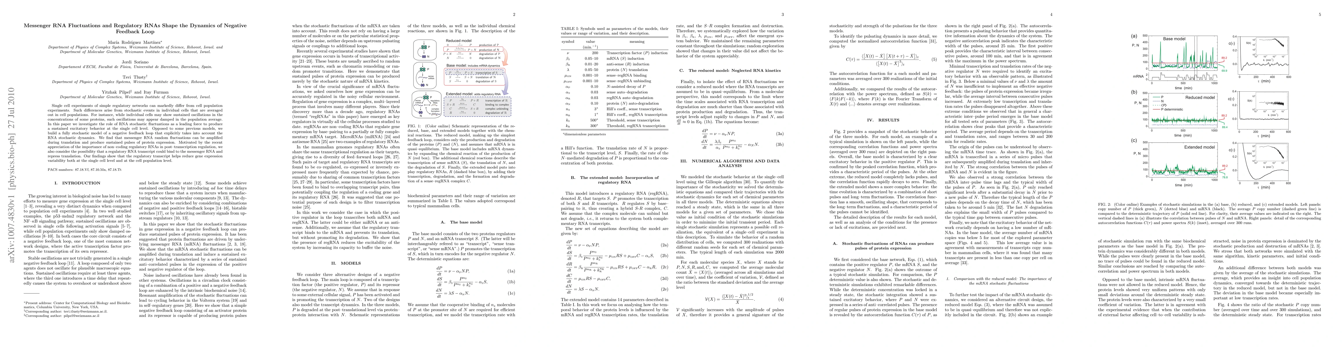 This paper investigates how RNA stochastic fluctuations and regulatory RNAs influence the dynamics of a negative feedback loop, finding that mRNA fluctuations can generate sustained protein oscillations in individual cells, while regulatory RNAs can reduce expression variability at both single-cell and population levels.