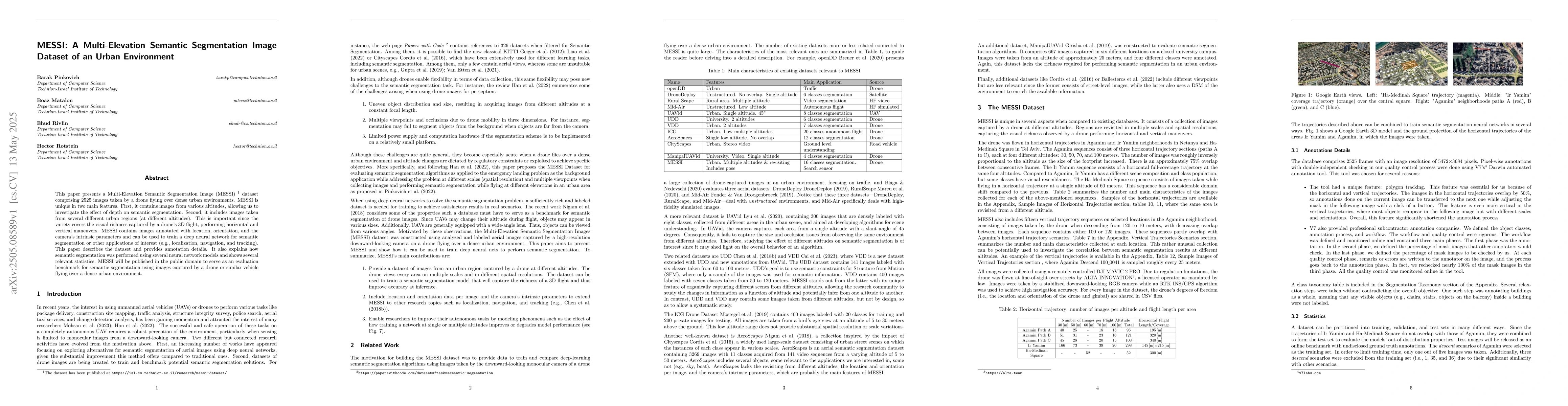 This paper presents a Multi-Elevation Semantic Segmentation Image (MESSI) dataset comprising 2525 images taken by a drone flying over dense urban environments. MESSI is unique in two main features. First, it contains images from various altitudes, allowing us to investigate the effect of depth on semantic segmentation. Second, it includes images taken from several different urban regions (at different altitudes). This is important since the variety covers the visual richness captured by a drone's 3D flight, performing horizontal and vertical maneuvers. MESSI contains images annotated with location, orientation, and the camera's intrinsic parameters and can be used to train a deep neural network for semantic segmentation or other applications of interest (e.g., localization, navigation, and tracking). This paper describes the dataset and provides annotation details. It also explains how semantic segmentation was performed using several neural network models and shows several relevant statistics. MESSI will be published in the public domain to serve as an evaluation benchmark for semantic segmentation using images captured by a drone or similar vehicle flying over a dense urban environment.