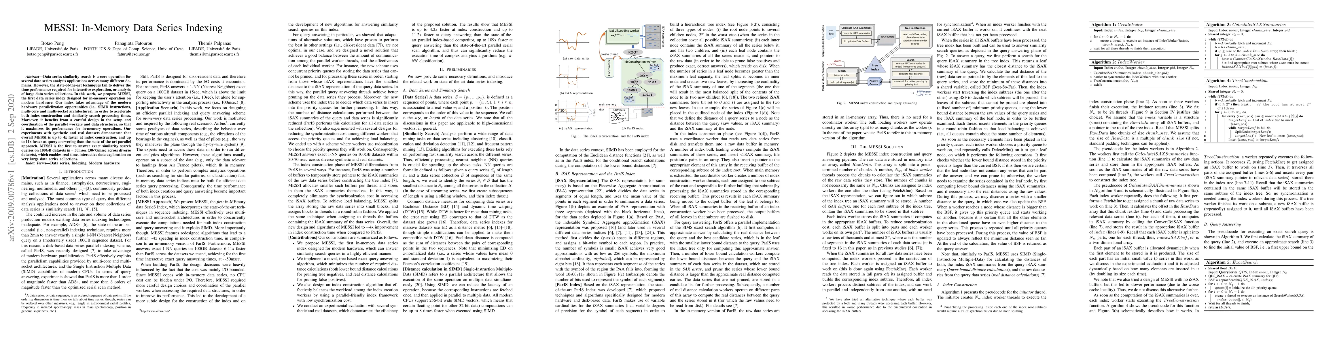 MESSI is an in-memory data series indexing method designed to leverage modern hardware for parallelization, achieving up to 4x faster index construction and 11x faster query answering compared to existing techniques. It enables real-time, interactive exploration of large data series collections, answering exact similarity search queries on 100GB datasets in under 75msec.