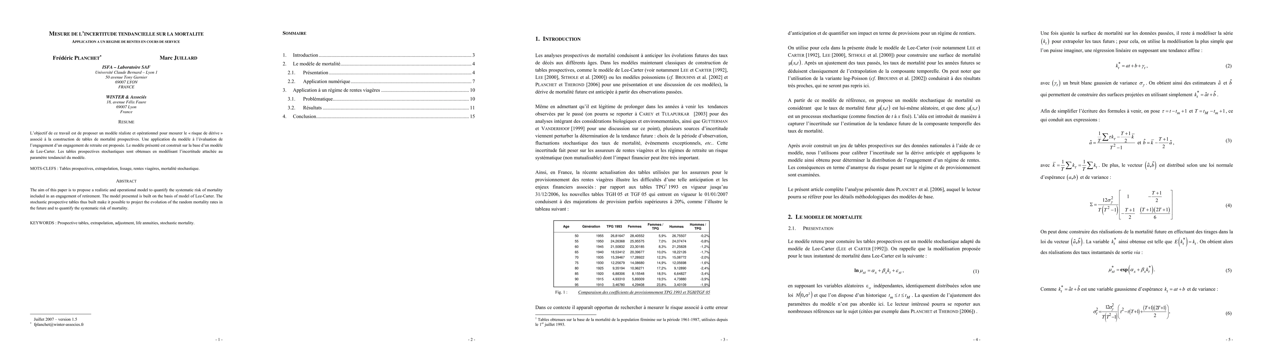 The aim of this paper is to propose a realistic and operational model to quantify the systematic risk of mortality included in an engagement of retirement. The model presented is built on the basis of model of Lee-Carter. The stochastic prospective tables thus built make it possible to project the evolution of the random mortality rates in the future and to quantify the systematic risk of mortality.