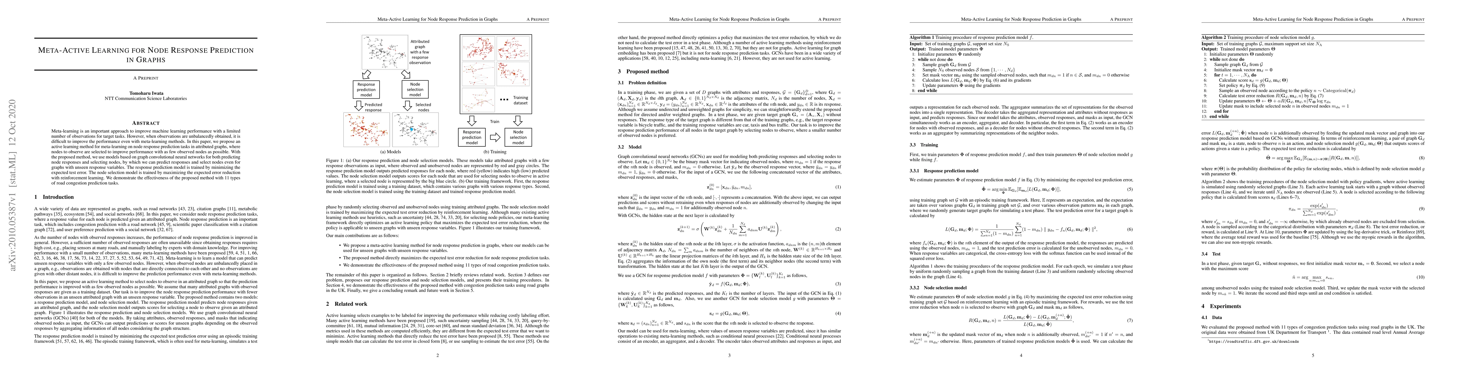 Meta-learning is an important approach to improve machine learning performance with a limited number of observations for target tasks. However, when observations are unbalancedly obtained, it is difficult to improve the performance even with meta-learning methods. In this paper, we propose an active learning method for meta-learning on node response prediction tasks in attributed graphs, where nodes to observe are selected to improve performance with as few observed nodes as possible. With the proposed method, we use models based on graph convolutional neural networks for both predicting node responses and selecting nodes, by which we can predict responses and select nodes even for graphs with unseen response variables. The response prediction model is trained by minimizing the expected test error. The node selection model is trained by maximizing the expected error reduction with reinforcement learning. We demonstrate the effectiveness of the proposed method with 11 types of road congestion prediction tasks.
