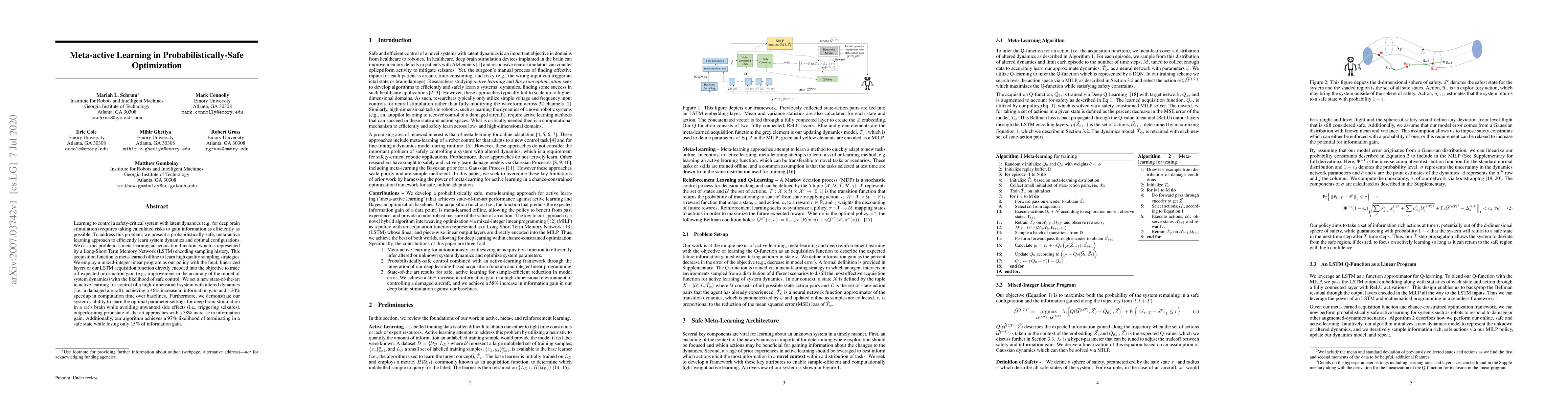 Learning to control a safety-critical system with latent dynamics (e.g. for deep brain stimulation) requires taking calculated risks to gain information as efficiently as possible. To address this problem, we present a probabilistically-safe, meta-active learning approach to efficiently learn system dynamics and optimal configurations. We cast this problem as meta-learning an acquisition function, which is represented by a Long-Short Term Memory Network (LSTM) encoding sampling history. This acquisition function is meta-learned offline to learn high quality sampling strategies. We employ a mixed-integer linear program as our policy with the final, linearized layers of our LSTM acquisition function directly encoded into the objective to trade off expected information gain (e.g., improvement in the accuracy of the model of system dynamics) with the likelihood of safe control. We set a new state-of-the-art in active learning for control of a high-dimensional system with altered dynamics (i.e., a damaged aircraft), achieving a 46% increase in information gain and a 20% speedup in computation time over baselines. Furthermore, we demonstrate our system's ability to learn the optimal parameter settings for deep brain stimulation in a rat's brain while avoiding unwanted side effects (i.e., triggering seizures), outperforming prior state-of-the-art approaches with a 58% increase in information gain. Additionally, our algorithm achieves a 97% likelihood of terminating in a safe state while losing only 15% of information gain.