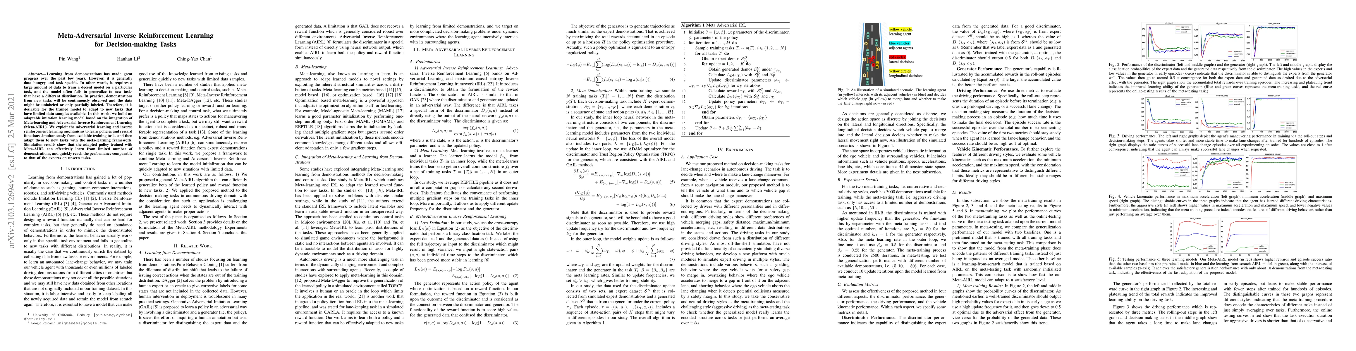This paper proposes an adaptable imitation learning model combining Meta-learning and Adversarial Inverse Reinforcement Learning (Meta-AIRL) to effectively learn from limited data and generalize to new tasks. Simulation results demonstrate that Meta-AIRL can quickly adapt to new tasks with few demonstrations, achieving performance comparable to expert models.