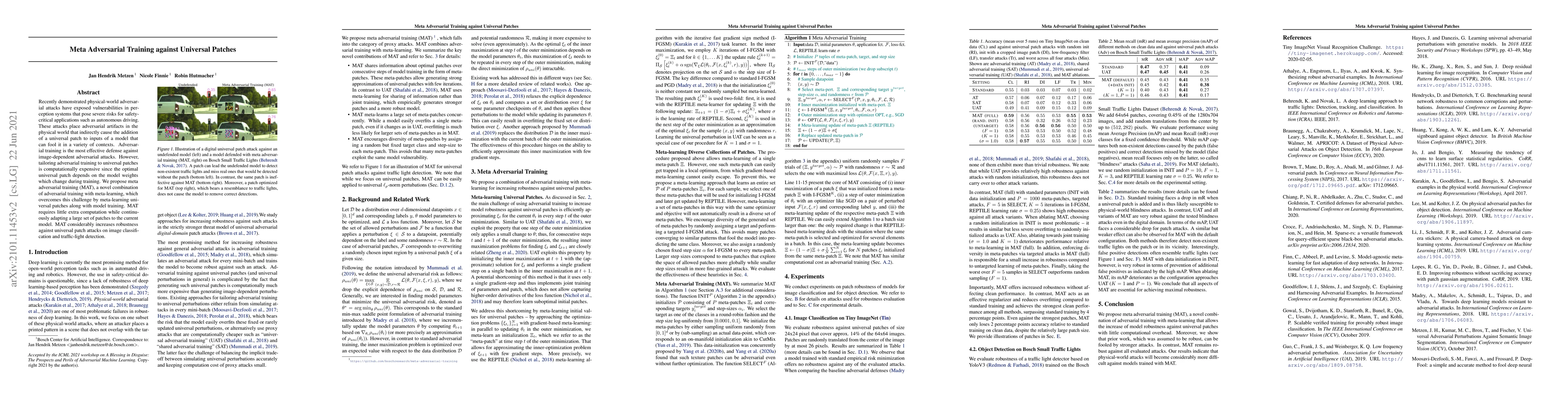This paper proposes meta adversarial training (MAT) to defend against universal patch attacks in perception systems, combining adversarial training with meta-learning to efficiently adapt a diverse set of patches during training. MAT enhances robustness against such attacks with minimal additional computational cost.