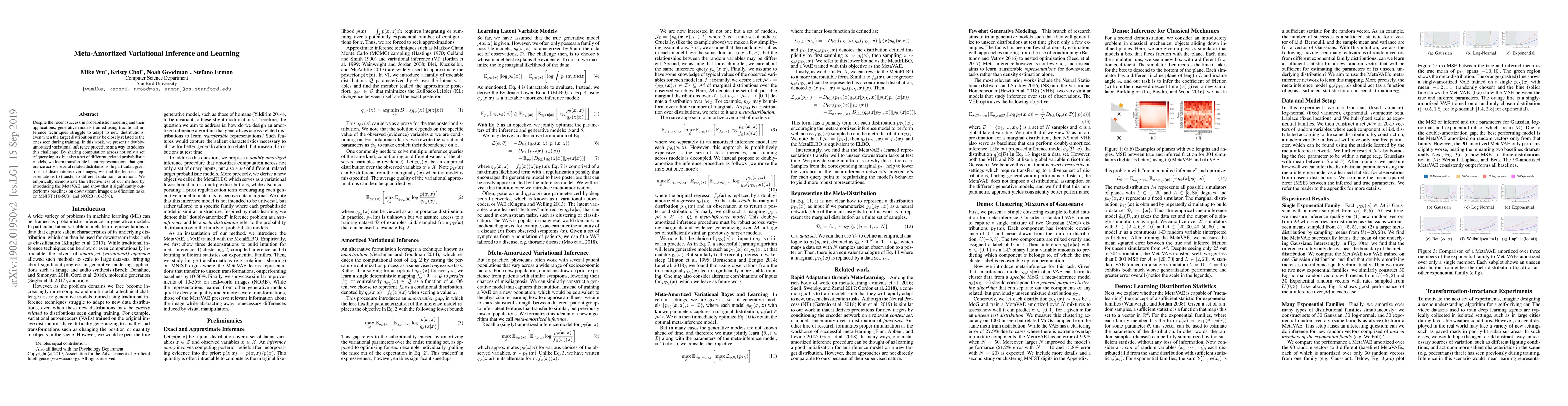 This paper introduces a doubly-amortized variational inference method to enable generative models to adapt to new distributions. The MetaVAE demonstrates significant improvements over baselines in image classification tasks on MNIST and NORB, showing the effectiveness of learning transferable latent representations.