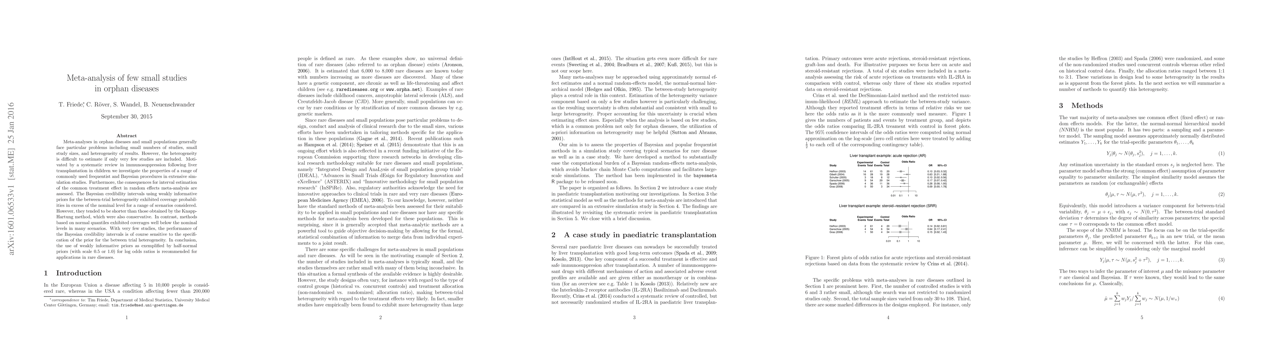 Meta-analyses in orphan diseases and small populations generally face particular problems including small numbers of studies, small study sizes, and heterogeneity of results. However, the heterogeneity is difficult to estimate if only very few studies are included. Motivated by a systematic review in immunosuppression following liver transplantation in children we investigate the properties of a range of commonly used frequentist and Bayesian procedures in extensive simulation studies. Furthermore, the consequences for interval estimation of the common treatment effect in random effects meta-analysis are assessed. The Bayesian credibility intervals using weakly informative priors for the between-trial heterogeneity exhibited coverage probabilities in excess of the nominal level for a range of scenarios considered. However, they tended to be shorter than those obtained by the Knapp-Hartung method, which were also conservative. In contrast, methods based on normal quantiles exhibited coverages well below the nominal levels in many scenarios. With very few studies, the performance of the Bayesian credibility intervals is of course sensitive to the specification of the prior for the between trial heterogeneity. In conclusion, the use of weakly informative priors as exemplified by half-normal priors (with scale 0.5 or 1.0) for log odds ratios is recommended for applications in rare diseases.