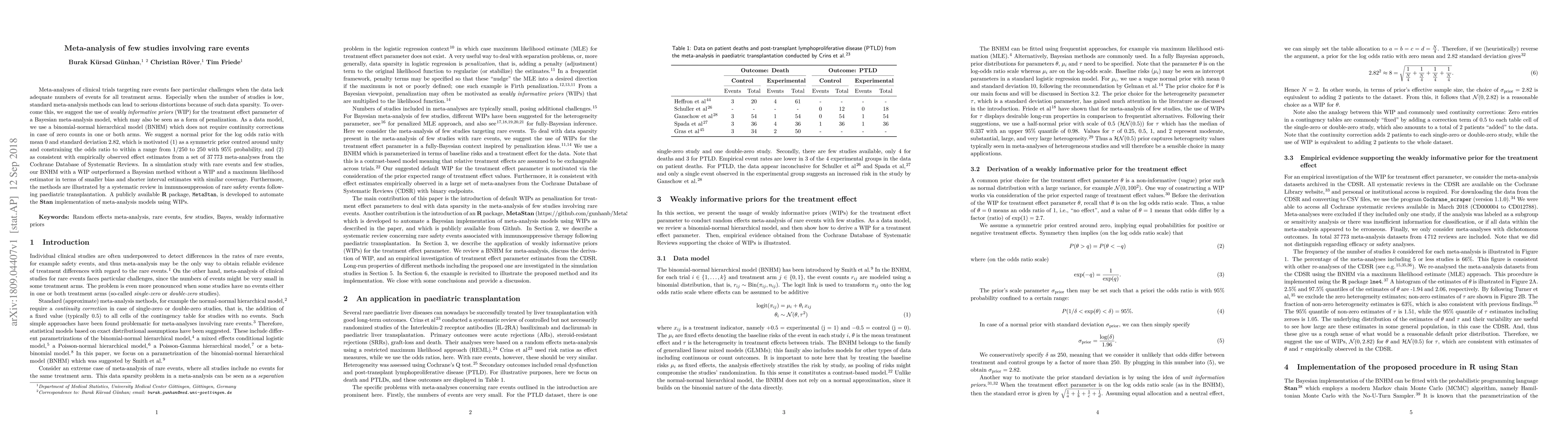 This paper proposes a Bayesian meta-analysis model using weakly informative priors (WIP) to address the challenges of sparse data in clinical trials targeting rare events. The binomial-normal hierarchical model (BNHM) with a normal prior for the log odds ratio showed better performance in simulations compared to alternative methods, and is demonstrated through a case study on immunosuppression safety events in pediatric transplantation.