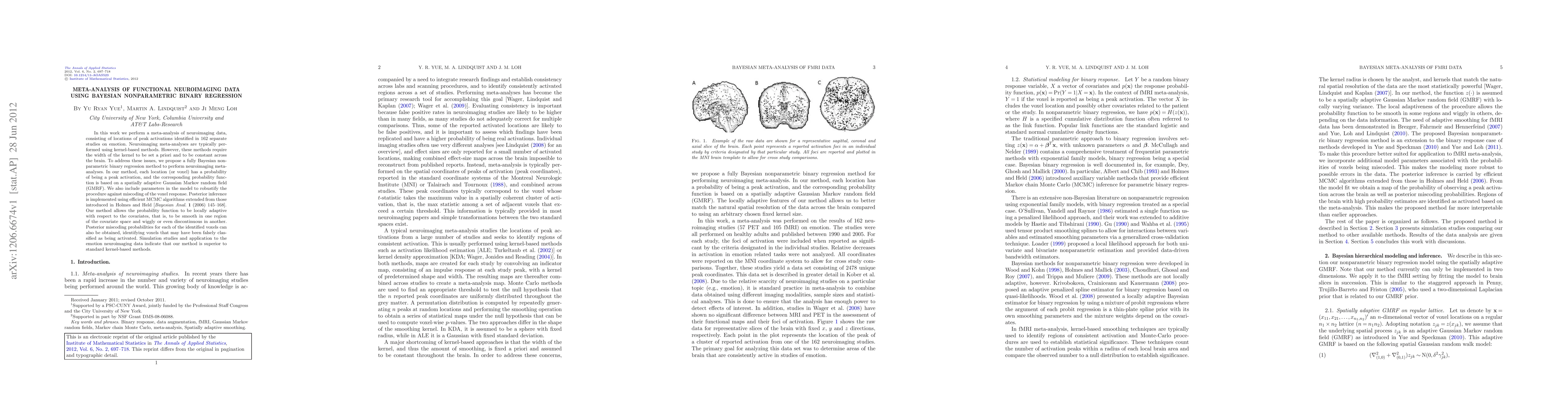 In this work we perform a meta-analysis of neuroimaging data, consisting of locations of peak activations identified in 162 separate studies on emotion. Neuroimaging meta-analyses are typically performed using kernel-based methods. However, these methods require the width of the kernel to be set a priori and to be constant across the brain. To address these issues, we propose a fully Bayesian nonparametric binary regression method to perform neuroimaging meta-analyses. In our method, each location (or voxel) has a probability of being a peak activation, and the corresponding probability function is based on a spatially adaptive Gaussian Markov random field (GMRF). We also include parameters in the model to robustify the procedure against miscoding of the voxel response. Posterior inference is implemented using efficient MCMC algorithms extended from those introduced in Holmes and Held [Bayesian Anal. 1 (2006) 145--168]. Our method allows the probability function to be locally adaptive with respect to the covariates, that is, to be smooth in one region of the covariate space and wiggly or even discontinuous in another. Posterior miscoding probabilities for each of the identified voxels can also be obtained, identifying voxels that may have been falsely classified as being activated. Simulation studies and application to the emotion neuroimaging data indicate that our method is superior to standard kernel-based methods.
