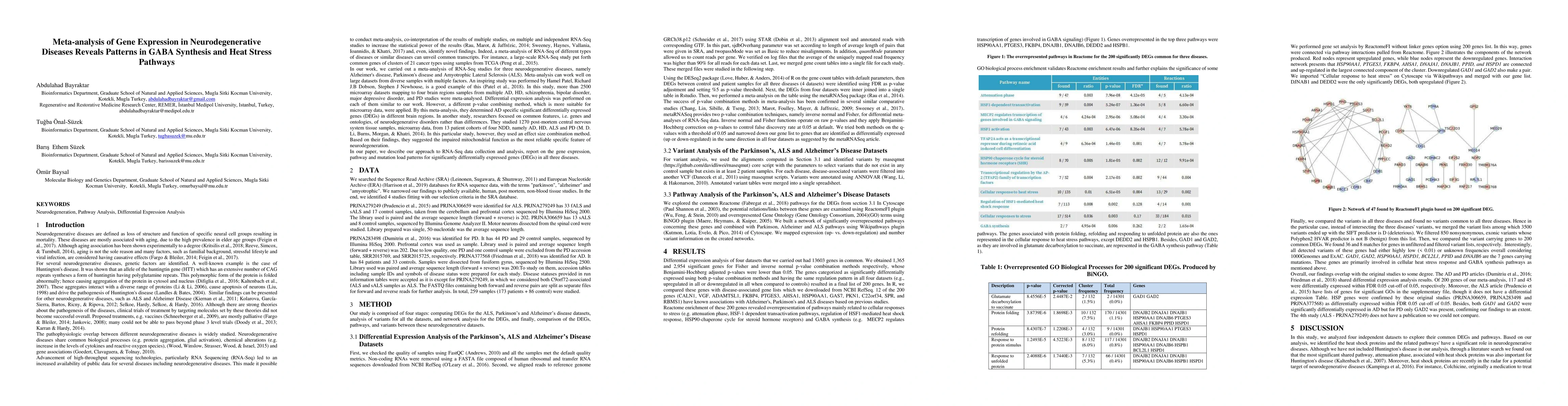 This meta-analysis of gene expression in Alzheimer's, Parkinson's, and ALS reveals shared patterns in GABA synthesis and heat stress pathways, indicating common pathological mechanisms across these neurodegenerative diseases. The study found downregulated GABA synthesis genes and upregulated heat stress response genes, highlighting their potential roles in disease progression.