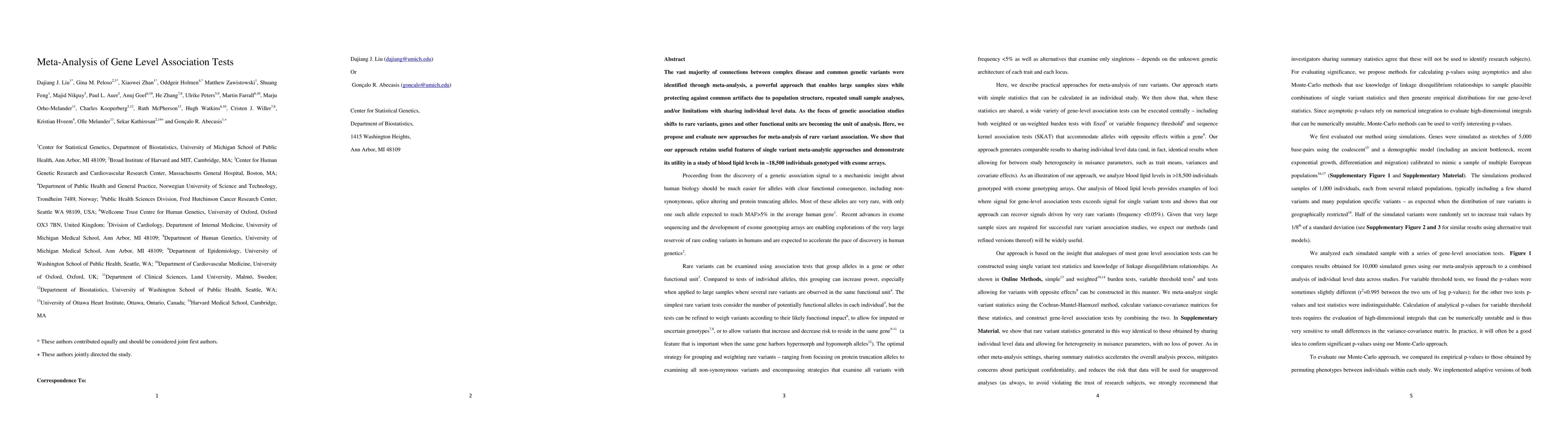This paper proposes new methods for meta-analysis of rare variant association studies, emphasizing the shift from single variant to gene-level analysis. The authors demonstrate the effectiveness of their approach through an application to blood lipid levels in a large sample of exome array genotyped individuals.