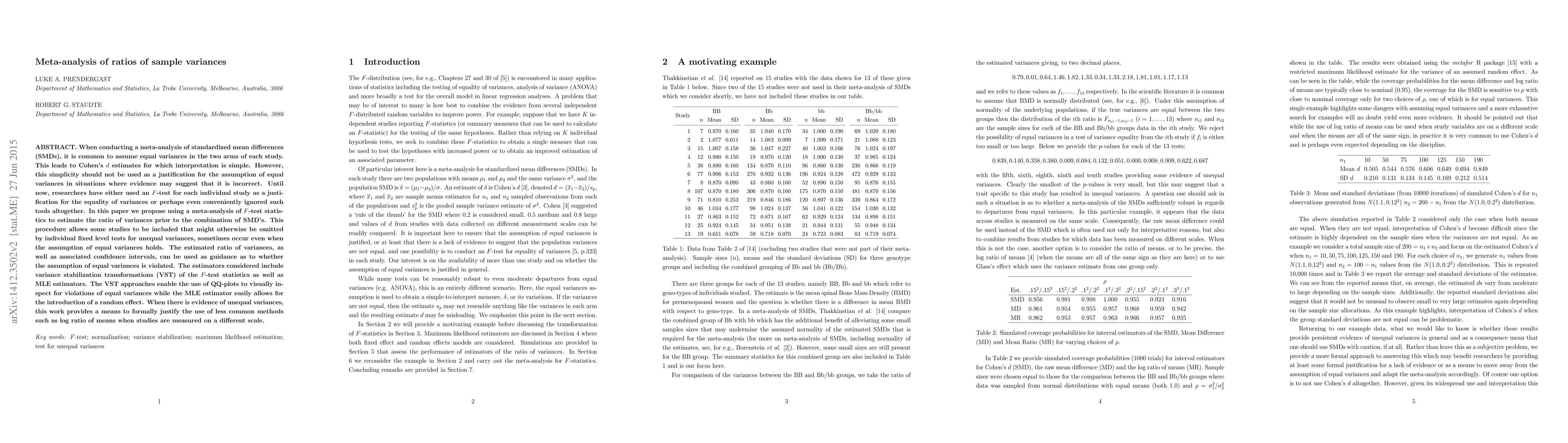 When conducting a meta-analysis of standardized mean differences (SMDs), it is common to assume equal variances in the two arms of each study. This leads to Cohen's $d$ estimates for which interpretation is simple. However, this simplicity should not be used as a justification for the assumption of equal variances in situations where evidence may suggest that it is incorrect. Until now, researchers have either used an $F$-test for each individual study as a justification for the equality of variances or perhaps even conveniently ignored such tools altogether. In this paper we propose using a meta-analysis of F-test statistics to estimate the ratio of variances prior to the combination of SMD's. This procedure allows some studies to be included that might otherwise be omitted by individual fixed level tests for unequal variances, sometimes occur even when the assumption of equal variances holds. The estimated ratio of variances, as well as associated confidence intervals, can be used as guidance as to whether the assumption of equal variances is violated. The estimators considered include variance stabilization transformations (VST) of the $F$-test statistics as well as MLE estimators. The VST approaches enable the use of QQ-plots to visually inspect for violations of equal variances while the MLE estimator easily allows for the introduction of a random effect. When there is evidence of unequal variances, this work provides a means to formally justify the use of less common methods such as log ratio of means when studies are measured on a different scale.