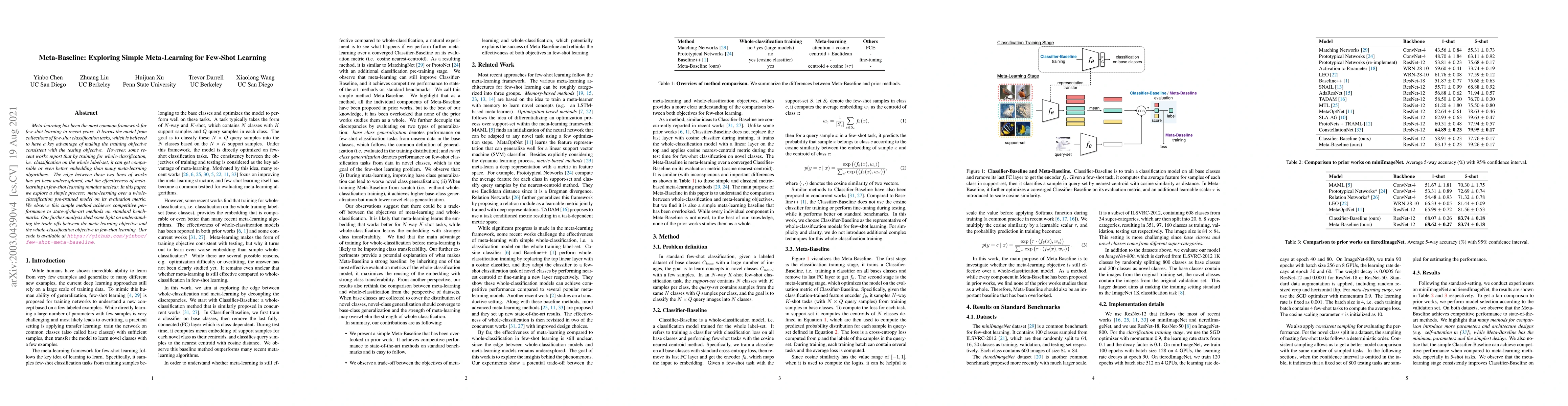 This paper investigates simple meta-learning applied to a whole-classification pre-trained model for few-shot learning, demonstrating competitive performance against state-of-the-art methods. The study also provides insights into the trade-offs between meta-learning and whole-classification objectives in this context.