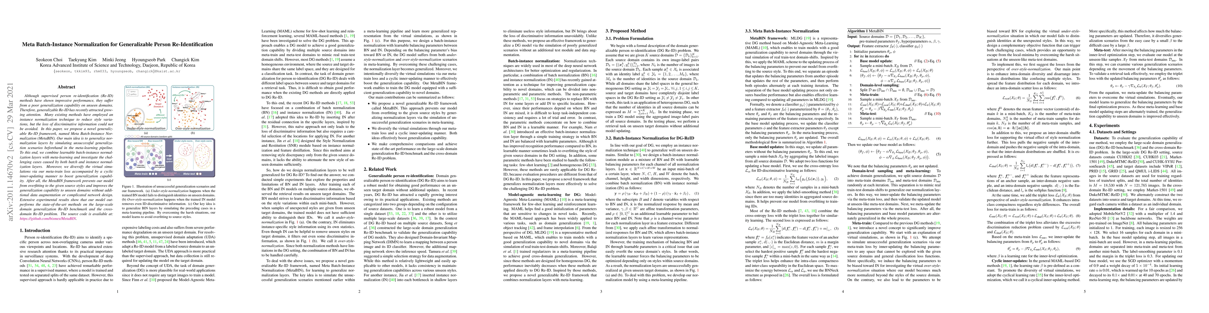 This paper introduces Meta Batch-Instance Normalization (MetaBIN) for generalizable person re-identification, combining meta-learning with normalization layers to enhance model generalization without overfitting to specific styles. The proposed framework outperforms existing methods on domain generalization and cross-domain re-identification benchmarks.