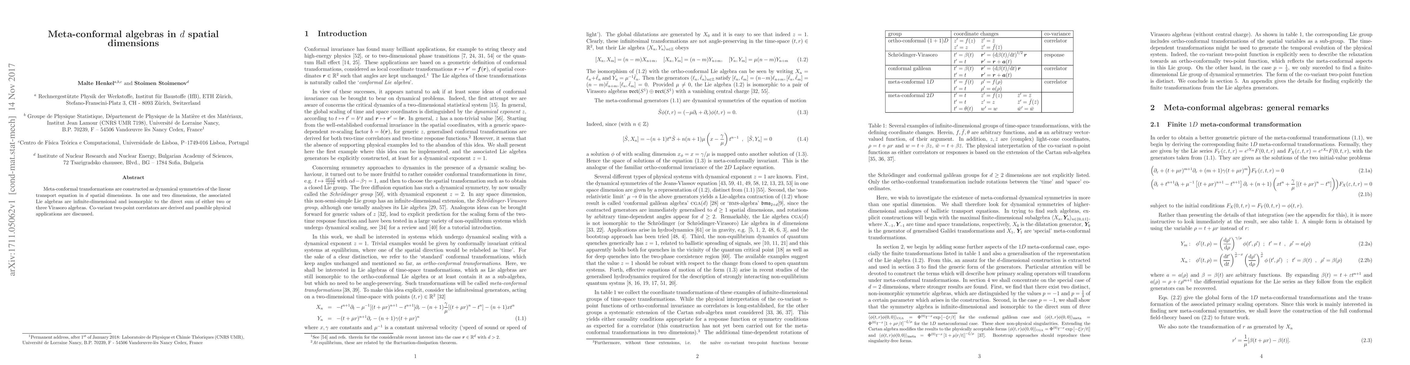 This paper constructs meta-conformal algebras as symmetries of the linear transport equation in $d$ spatial dimensions, revealing infinite-dimensional Lie algebras isomorphic to sums of Virasoro algebras in 1D and 2D. It also derives covariant two-point correlators and explores potential physical applications.