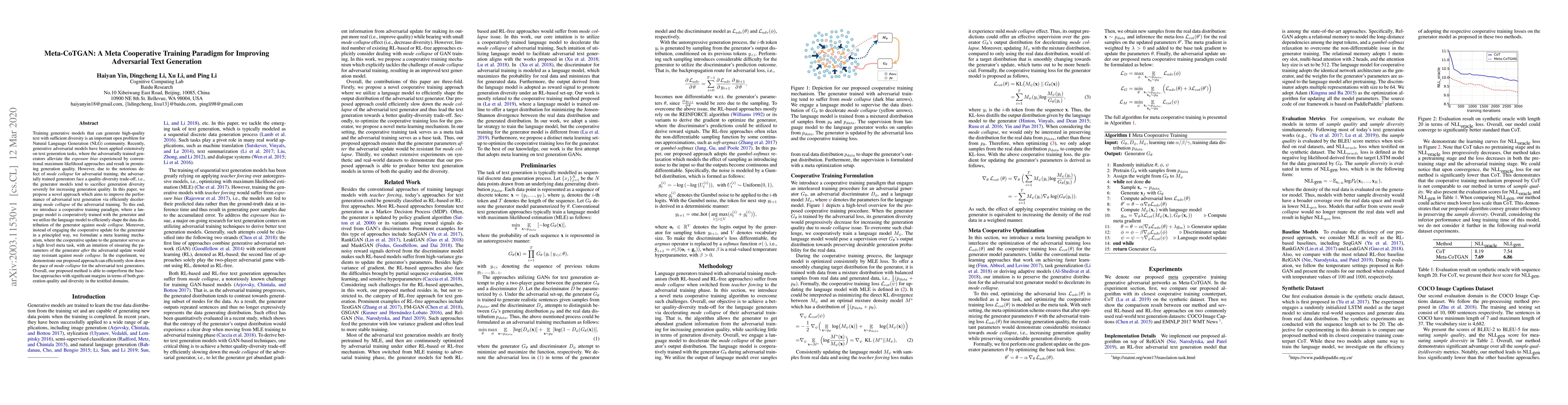 The paper proposes Meta-CoTGAN, a meta cooperative training paradigm to improve adversarial text generation by mitigating mode collapse and enhancing both generation quality and diversity. The approach employs a language model to shape the generator's data distribution and uses meta learning to ensure the generator's parameters remain resistant to mode collapse, resulting in superior performance over baseline methods.